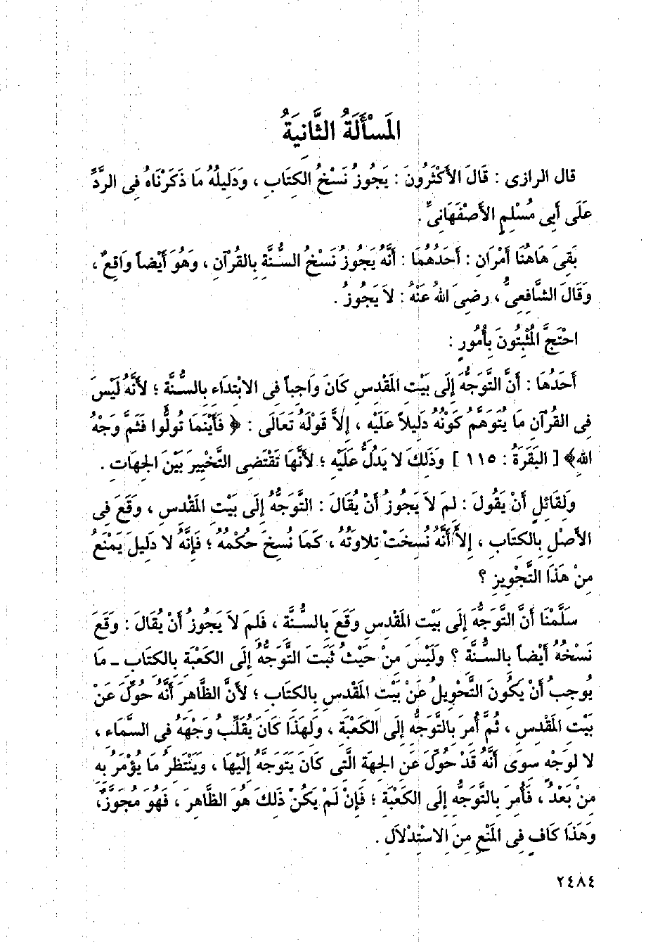 قال الرازي: قال الأكثرون: يجوز نسخ الكتاب، ودليله ما ذكرناه في الرد على أبي مسلم الأصفهاني.