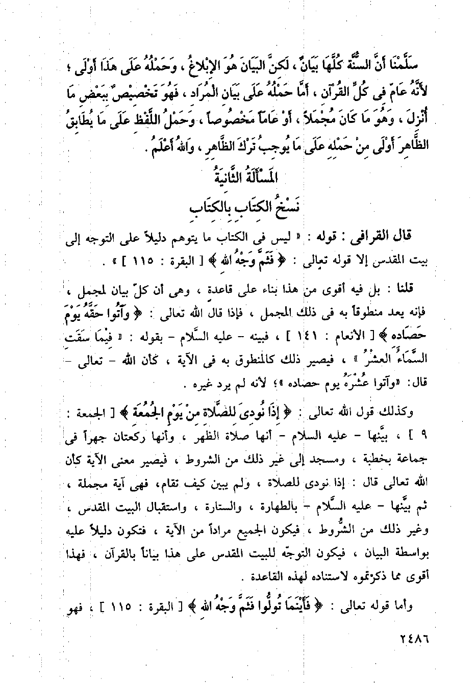 قال القرافي: قوله: "ليس في الكتاب ما يتوهم دليلًا على التوجه إلى بيت المقدس إلا قوله تعالى: {فثم وجه الله} [البقرة: 115] ".