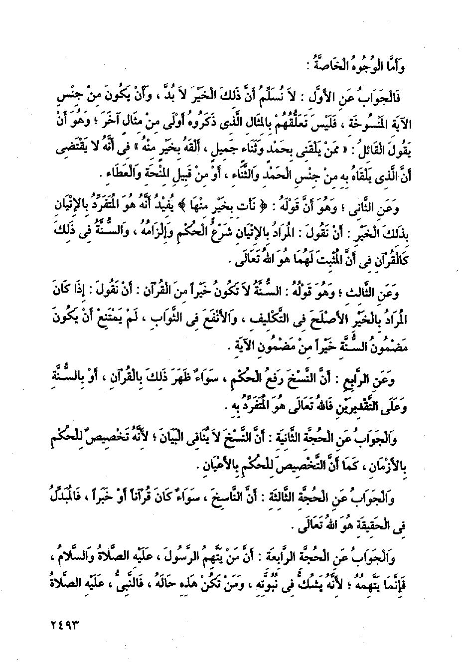 فالجواب عن الأول: لا نسلم ان ذلك الخير لا بد وأن يكون من جنس الآية المنسوخة، فليس تعلقهم بالمثال الذي ذكروه أولى من مثال آخر؛ وهو أن بقول القائل: (ممن يلقني بحمد وثناء جميل، ألقه بخير منه) في أنه لا يقتضي أن الذي يلقاه به من جنس الحمد والثناء، أو من قبيل المنحة والعطاء.