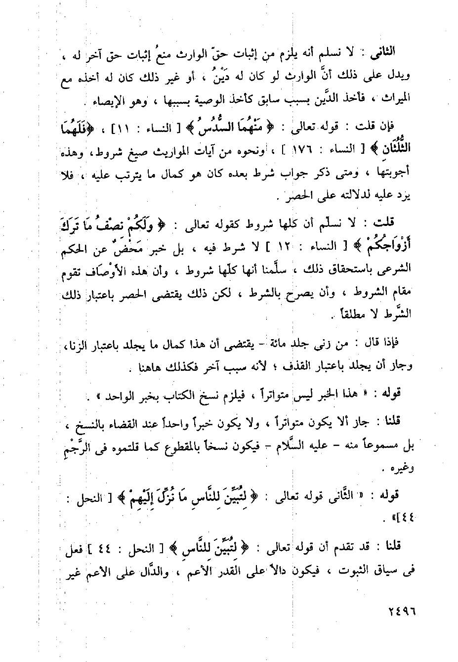 قلت: لا نسلم أن كلها شروط كقوله تعالى: {ولكم نصف ما ترك أزواجكم} [النساء: 12] لا شرط فيه، بل خبر محض عن الحكم الشرعي باستحقاق ذلك، سلمنا أنها كلها شروط، وأن هذه الأوصاف تقوم مقام الشروط، وأن يصرح بالشرط، لكن ذلك يقتضي الحصر باعتبار ذلك الشرط لا مطلقًا.