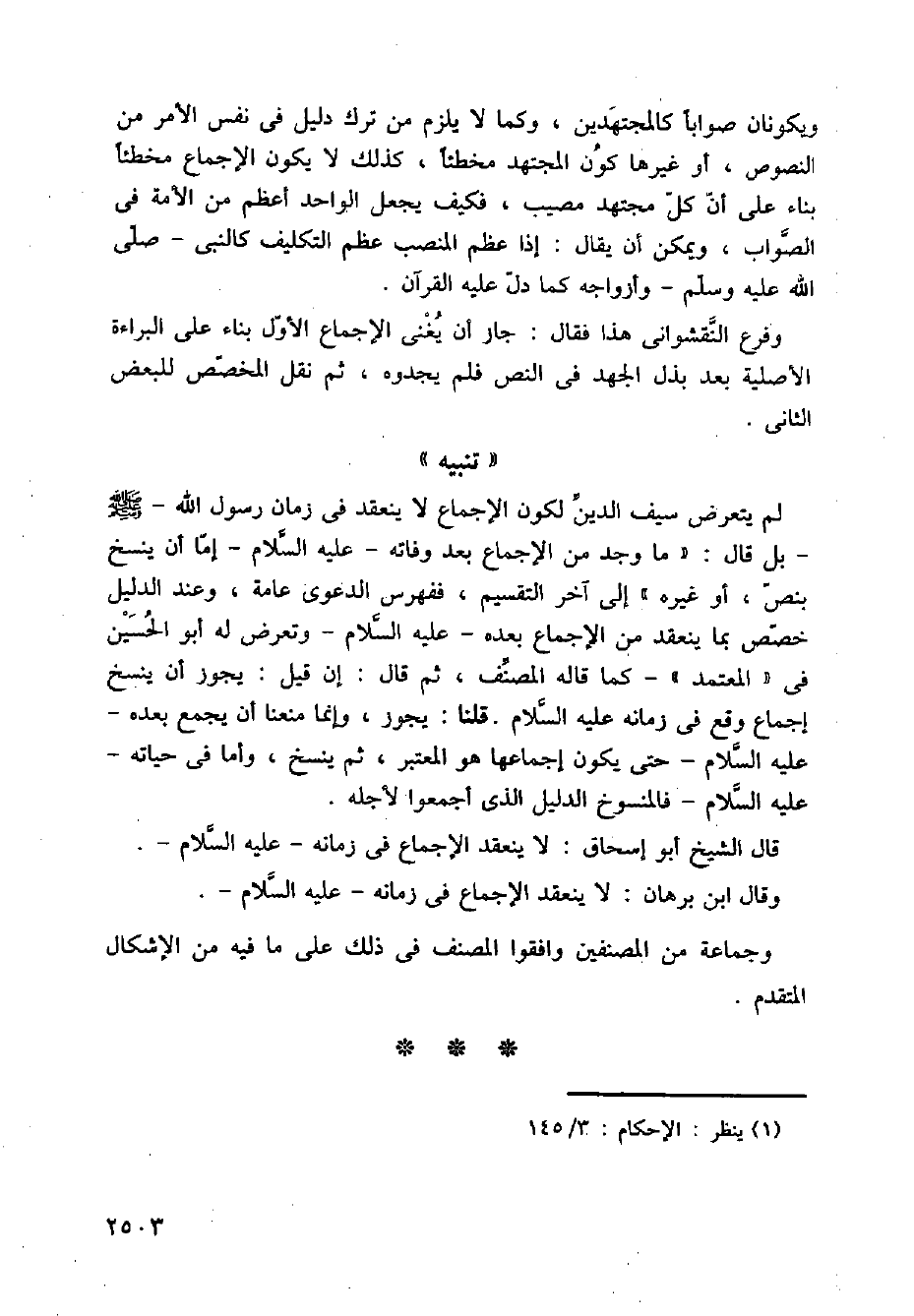 لم يتعرض سيف الدين لكون الإجماع لا ينعقد في زمان رسول الله صلى الله عليه وسلم بل قال: "ما وجد من الإجماع بعد وفاته عليه السلام إما أن ينسخ بنص أو غيره " إلى آخر التقسيم، ففهرس الدعوى عامة، وعند الدليل خصص بما ينعقد من الإجماع بعده عليه السلام وتعرض له أبو الحسين في (المعتمد) كما قاله المصنف، ثم قال: إن قيل: يجوز أن ينسخ إجماع وقع في زمانه عليه السلام حتى يكون إجماعها هو المعتبر، ثم ينسخ، وأما في حياته عليه السلام فالمنسوخ الدليل الذي أجمعوا لأجله.