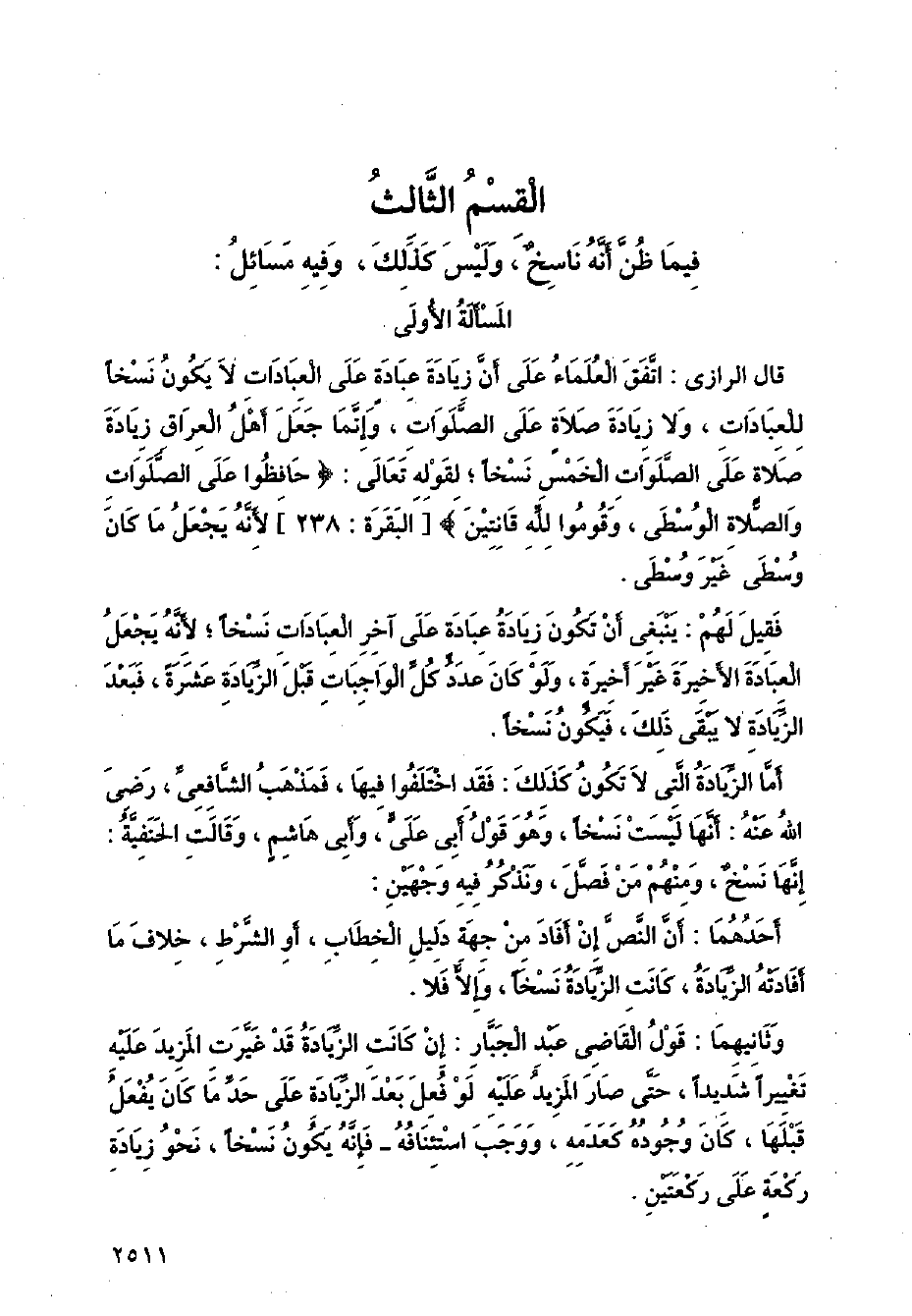قال الرازي: اتفق العلماء على أن زيادة عبادة على العبادات لا يكون نسخا للعبادات، ولا زيادة صلاة على الصلوات، وإنما جعل أهل العراق زيادة صلاة على الصلوات الخمس نسخا؛ لقوله تعالى: {حافظوا على الصلوات والصلاة الوسطى، وقوموا لله قانتين} [البقرة: 238] لانه يجعل ما كان وسطي غير وسطي.