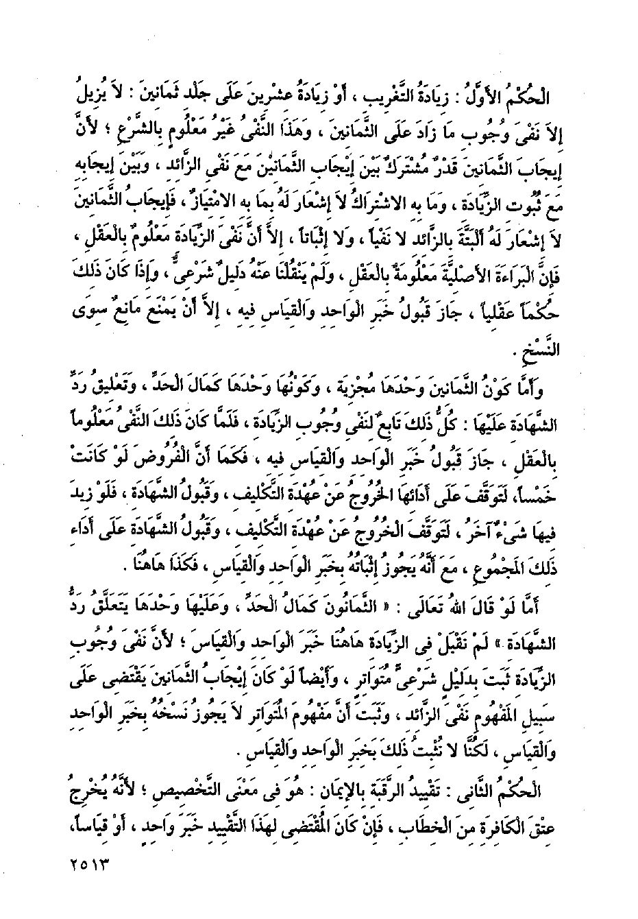 الحكم الأول: زيادة التغريب، أو زيادة عشرين على جلد ثمانين: لا يزيل إلا نفي وجوب ما زاد على الثمانين، وهذا النفي غير معلوم بالشرع؛ لأن إيجاب الثمانين قدر مشترك بين إيجاب الثمانين مع نفي الزائد، وبين إيجابه مع ثبوت الزيادة، وما به الاشتراك لا إشعار له بما به الامتياز، فإيجاب الثمانين لا إشعار له ألبتة بالزائد لا نفيا، ولا إثباتا، إلا أن نفي الزيادة معلوم بالعقل، فإن البراءة الأصلية معلومة بالعقل، ولم ينقلنا عنه دليل شرعي، وإذا كان ذلك حكما عقليا، جاز قبول خبر الواحد والقياس فيه، إلأا أن يمنع مانع سوى النسخ.