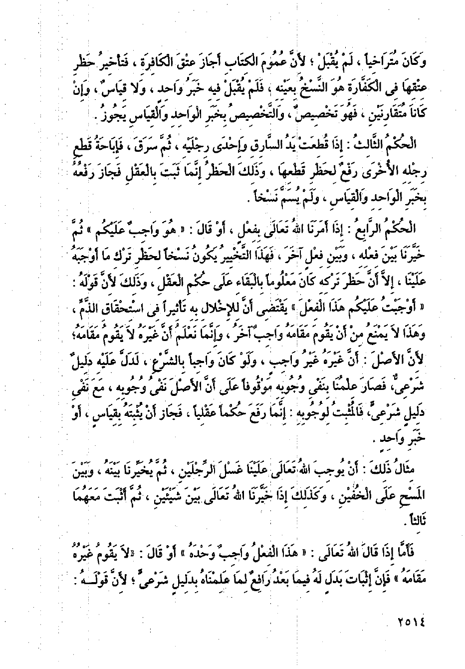 الحكم الرابع: إذا أمرنا الله تعالى بفعل، أو قال: " هو واجب عليكم " ثم خيرنا بين فعله، وبين فعل آخر، فهذا التخيير يكون نسخا لحظر ترك ما أوجبه علينا، إلا أن حظر تركه كان معموما بالبقاء على حكم العقل، وذلك لأن قوله: " أوجبت عليكم هذا الفعل " يقتضي أن للإخلال به تأثيرا في استحقاق الذم، وهذا لا يمنع من أن يقوم مقامه واجب آخر، وإنما نعلم أن غيره لا يقوم مقامه؛ لأن الأصل: أن غيره غير واجب، ولو كان واجبا بالشرع، لدل عليه دليل شرعي، فصار علمنا بنفي وجوبه موقوفا على أن الاصل نفي وجوبه، مع نفي دليل شرعي، فالمثبت لوجوبه: إنما رفع حكما عقليا، فجاز أن يثبته بقياس، أو خبر واحد.