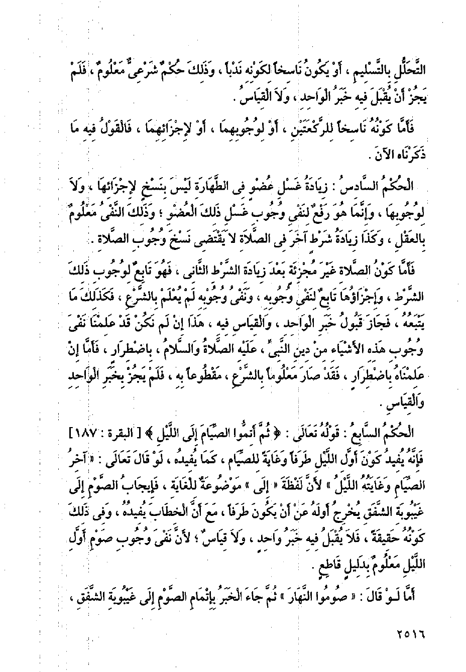 الحكم السابع: قوله تعالى: {ثم أتموا الصيام إلى الليل} [البقرة: 187] فإنه يفيد كون أول الليل طرفا وغاية للصيام، كما يفيده، لو قال تعالى: " آخر الصيام وغايته الليل " لأن لفظة (إلى) موضوعة للغاية، فإيجاب الصوم إلى غيبوبة الشفق يخرج أوله عن أن يكون طرفا، مع أن الخطاب يفيده، وفي ذلك كونه حقيقة، فلا يقبل فيه خبر واحد، ولا قياس؛ لأن نفي وجوب صوم أول الليل معلوم بدليل قاطع.
