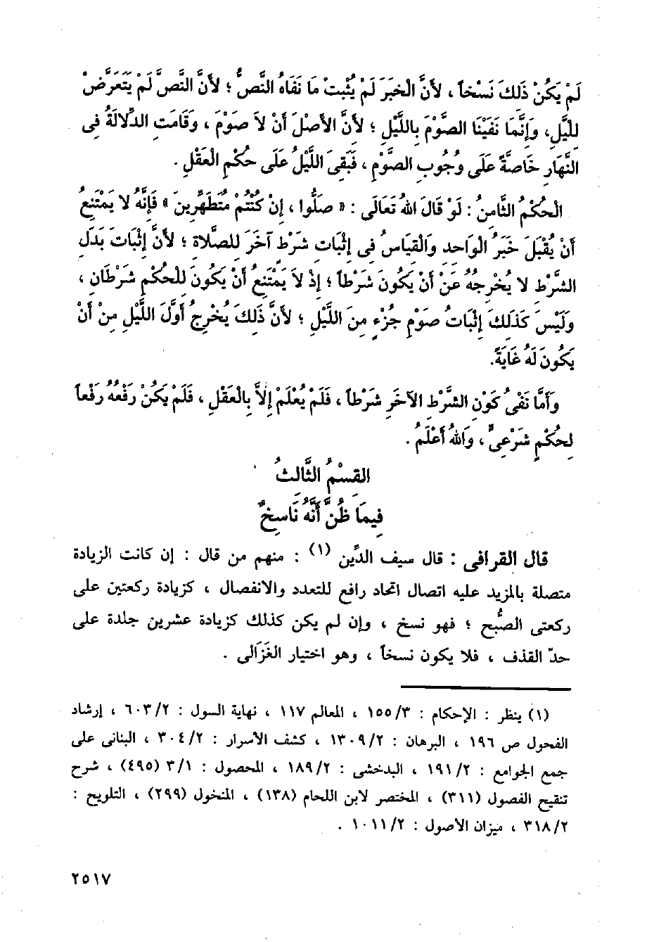 قال القرافي: قال سيف الدين: منهم من قال: إن كانت الزيادة متصلة بالمزيد عليه اتصال اتحاد رافع للتعدد والانفصال، كزيادة ركعتين على ركعتي الصبح؛ فهو نسخ، وإن لم يكن كذلك كزيادة عشرين جلدة على حد القذف، فلا يكون نسخا، وهو اختيار الغزالي.
