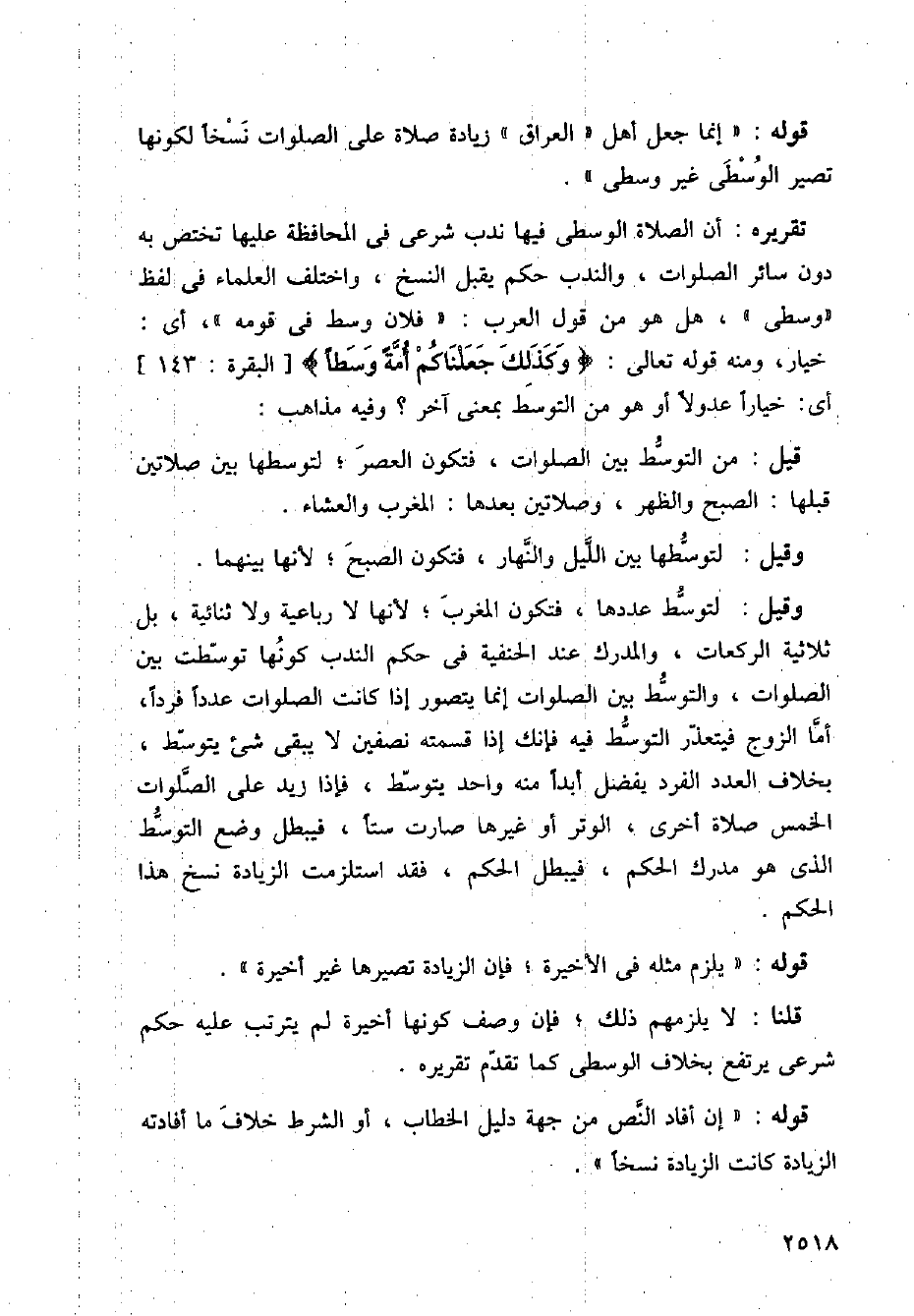 قوله: " إنما جعل أهل (العراق) زيادة صلاة على الصلوات نسخا لكونها تصير الوسطى غير وسطي ".