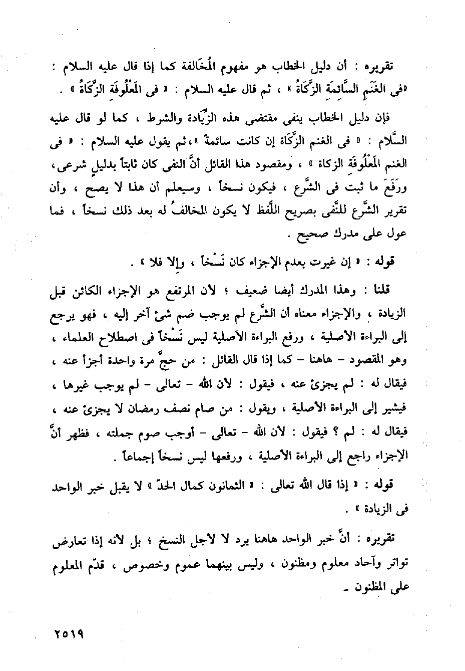 قلنا: وهذا المدرك أيضا ضعيف؛ لأن المرتفع هو الإجزاء الكائن قبل الزيادة، والإجزاء معناه أن الشرع لم يوجب ضم شيء آخر إليه، فهو يرجع إلى البراءة الأصلية، ورفع البراءة الأصلية ليس نسخا في إصطلاح العلماء، وهو المقصود هانا كما إذا قال القائل: من حج مرة واحدة أجزأ عنه، فقال له: لم يجزئ عنه، فيقول: لأن الله تعالى لم يوجب غيرها، فيشير إلى البراءة الأصلية، ويقول: من صام نصف رمضان لا يجزئ عنه، فيقال له: لم؟ فيقول: لأن الله تعالى أوجب صوم جملته، فظهر أن الإجزاء راجع إلى البراءة الأصلية، ورفعها ليس نسخا إجماعا.