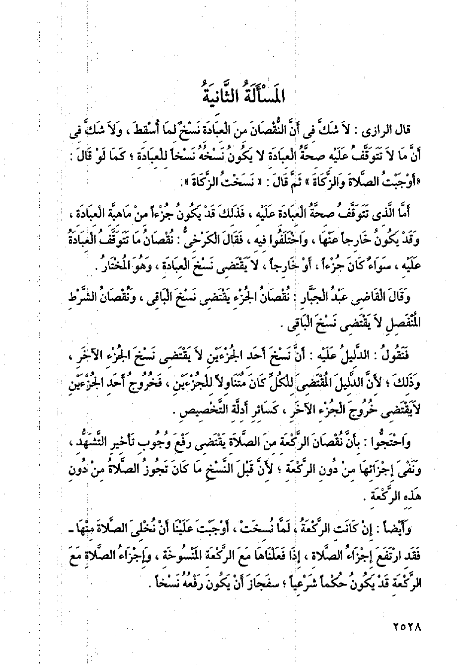 قال الرازي: لا شك في أن النقصان من العبادة نسخ لما أسقط، ولا شك في أن ما لا تتوقف عليه صحة العبادة لا يكون نسخه نسخا للعبادة؛ كما لو قال: " أوجبت الصلاة والزكاة " ثم قال: " نسخت الزكاة ".