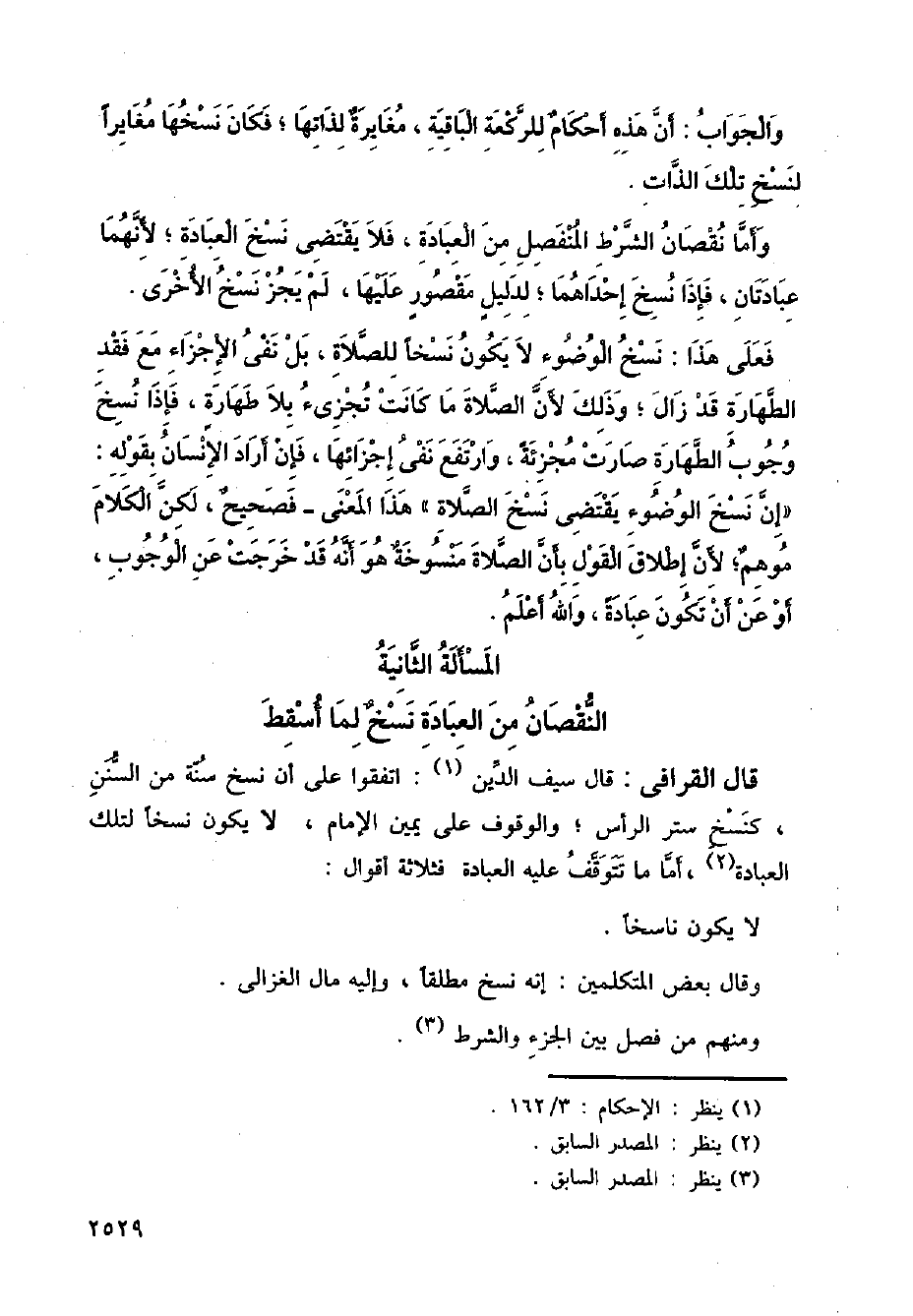 قال القرافي: قال سيف الدين: اتفقوا على أن نسخ سنة من السنن، كنسخ ستر الرأس؛ والوقوف على يمين الإمام، لا يكون نسخا لتلك العبادة، أما ما تتوقف عليه العبادة فثلاثة أقوال: