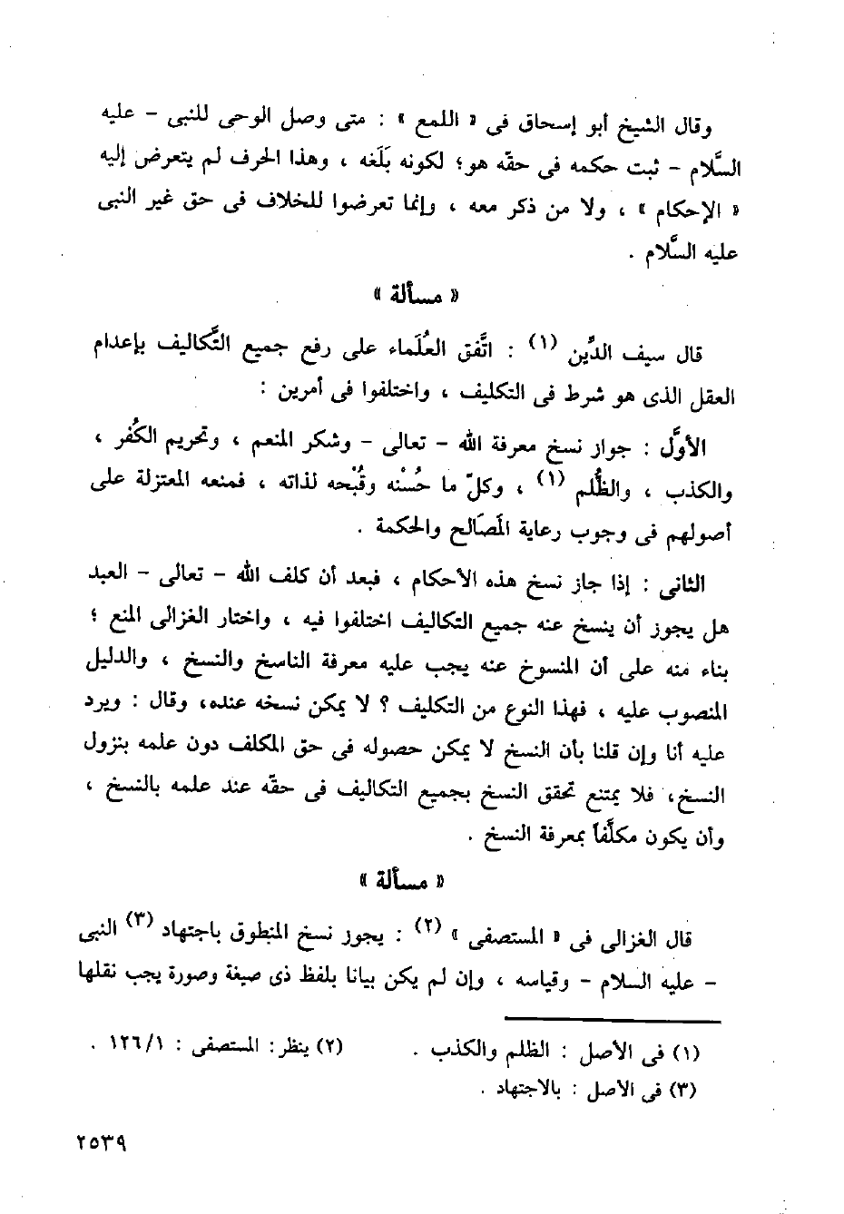 الثاني: إذا جاز نسخ هذه الأحكام، فبعد أن كلف الله - تعالى - العبد هل يجوز أن ينسخ عنه جميع التكاليف اختلفوا فيه، واختار الغزالي المنع؛ بناء منه على أن المنسوخ عنه يجب عليه معرفة الناسخ والنسخ، والدليل المنصوب عليه، فهذا النوع من التكليف؟ لا يمكن نسخه عنده، وقال: ويرد عليه أنا وإن قلنا بأن النسخ لا يمكن حصوله في حق المكلف دون علمه بنزول النسخ، فلا يمتنع تحقق النسخ بجميع التكاليف في حقه عند علمه بالنسخ، وأن يكون مكلفًا بمعرفة النسخ.