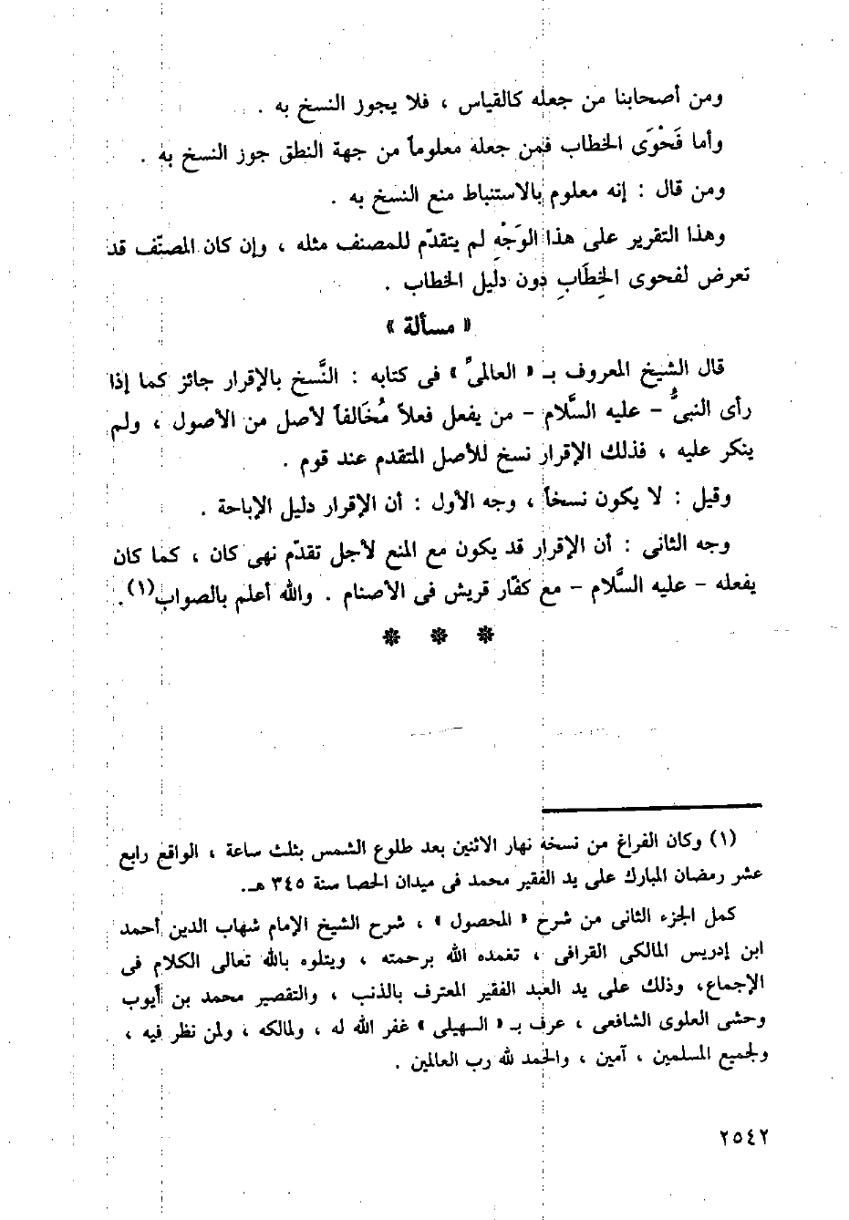 قال الشيخ المعروف بـ (العالمي) في كتابه: النسخ بالإقرار جائز كما إذا رأي النبي - عليه السلام - من يفعل فعلا مخالفًا لأصل من الأصول، ولم ينكر عليه، فذلك الإقرار نسخ للأصل المتقدم عند قوم.