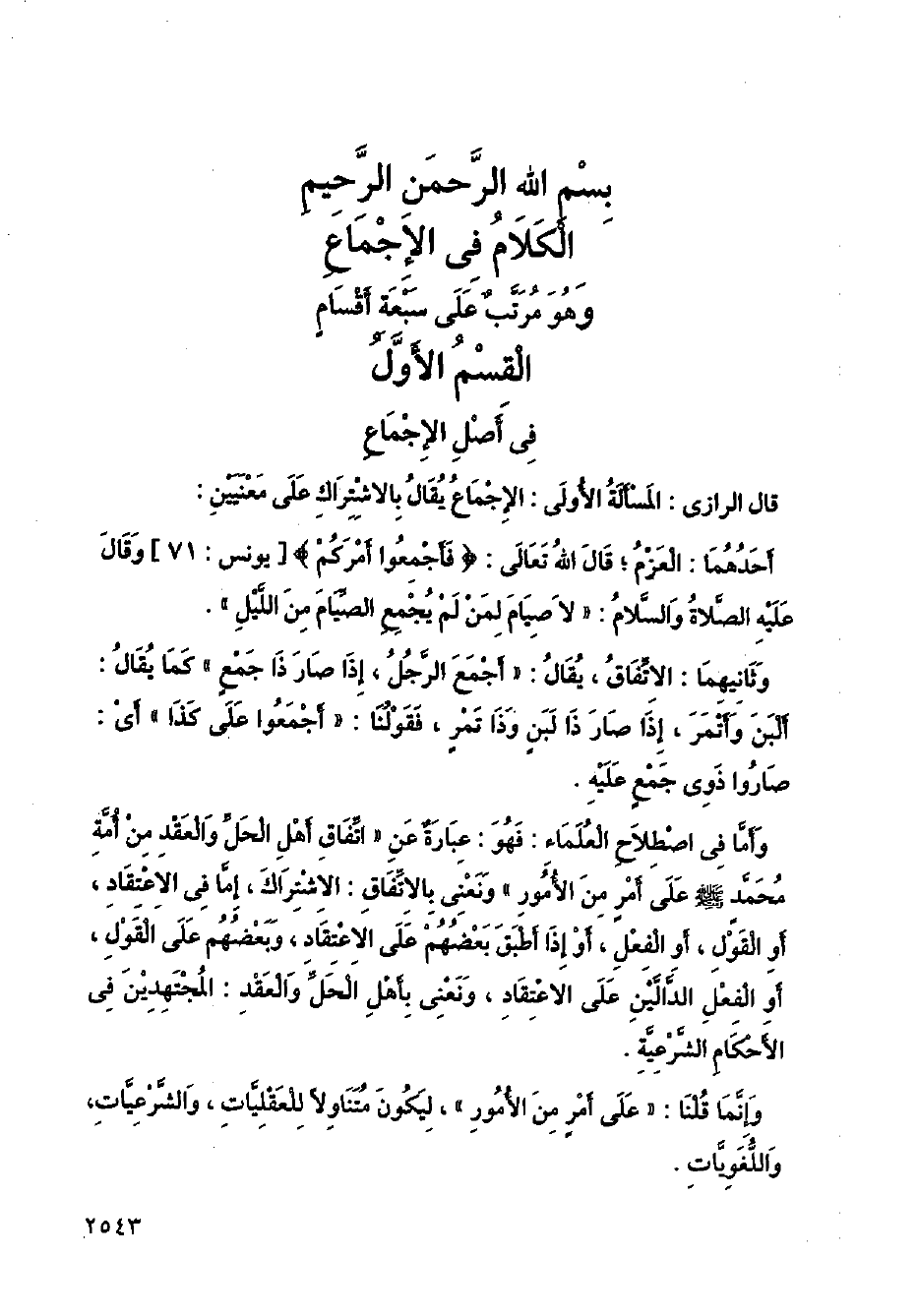 قال الرازي: المسألة الأولي: الإجماع يقال بالاشتراك على معنيين: