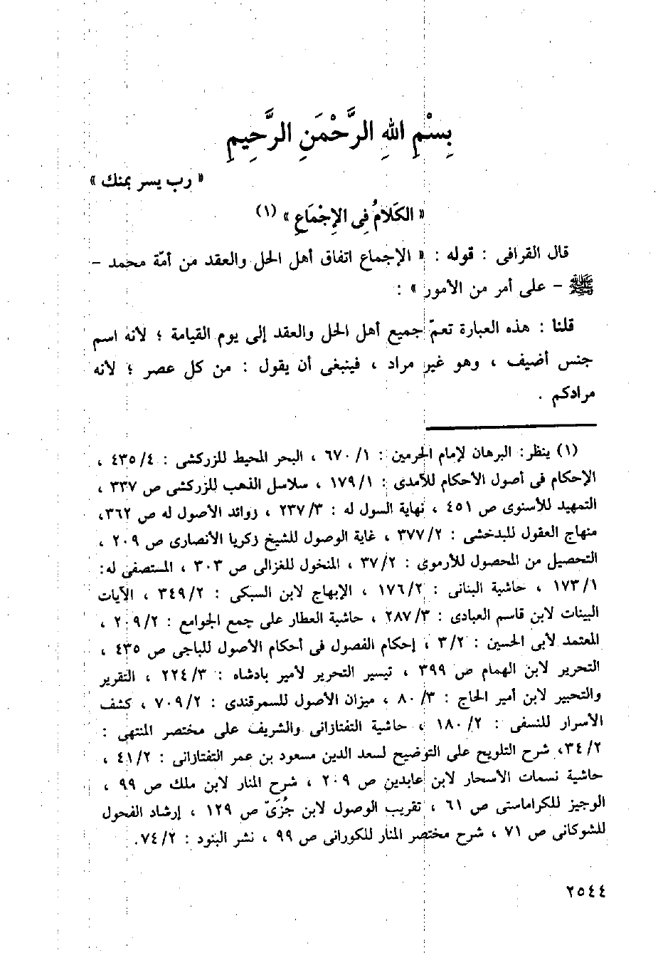 قال القرافي: قوله: (الإجماع اتفاق أهل الحل والعقد من أمة محمد - صلى الله عليه وسلم - على أمر من الأمور):