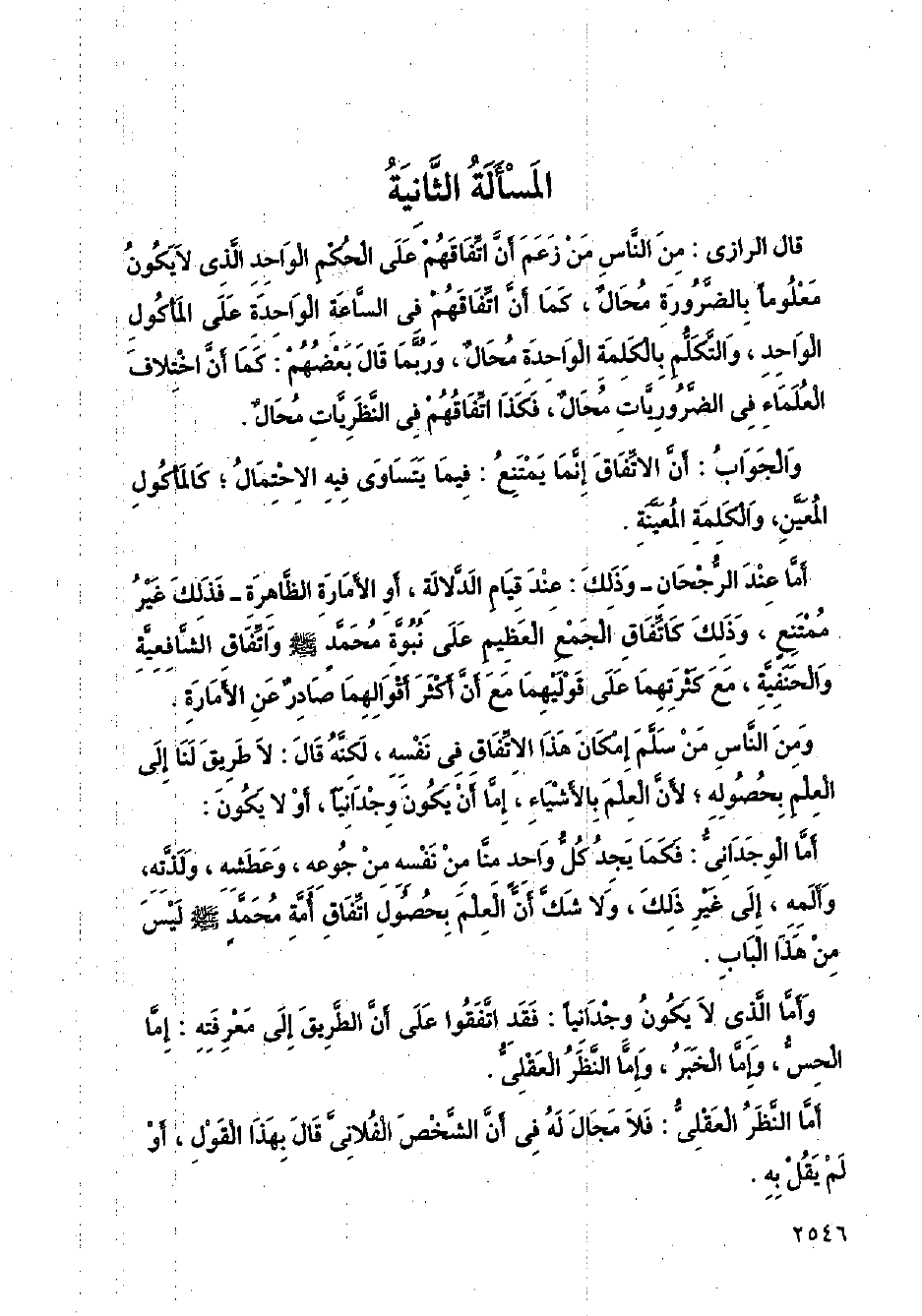 قال الرازي: من الناس من زعم أن اتفاقهم على الحكم الواحد الذي لا يكون معلومًا بالضرورة محال، كما أن اتفاقهم في الساعة الواحدة على المأكول الواحد، والتكلم بالكلمة الواحدة محال، وربما قال بعضهم: كما أن اختلاف العلماء في الضروريات محال، فكذا اتفاقهم في النظريات محال.