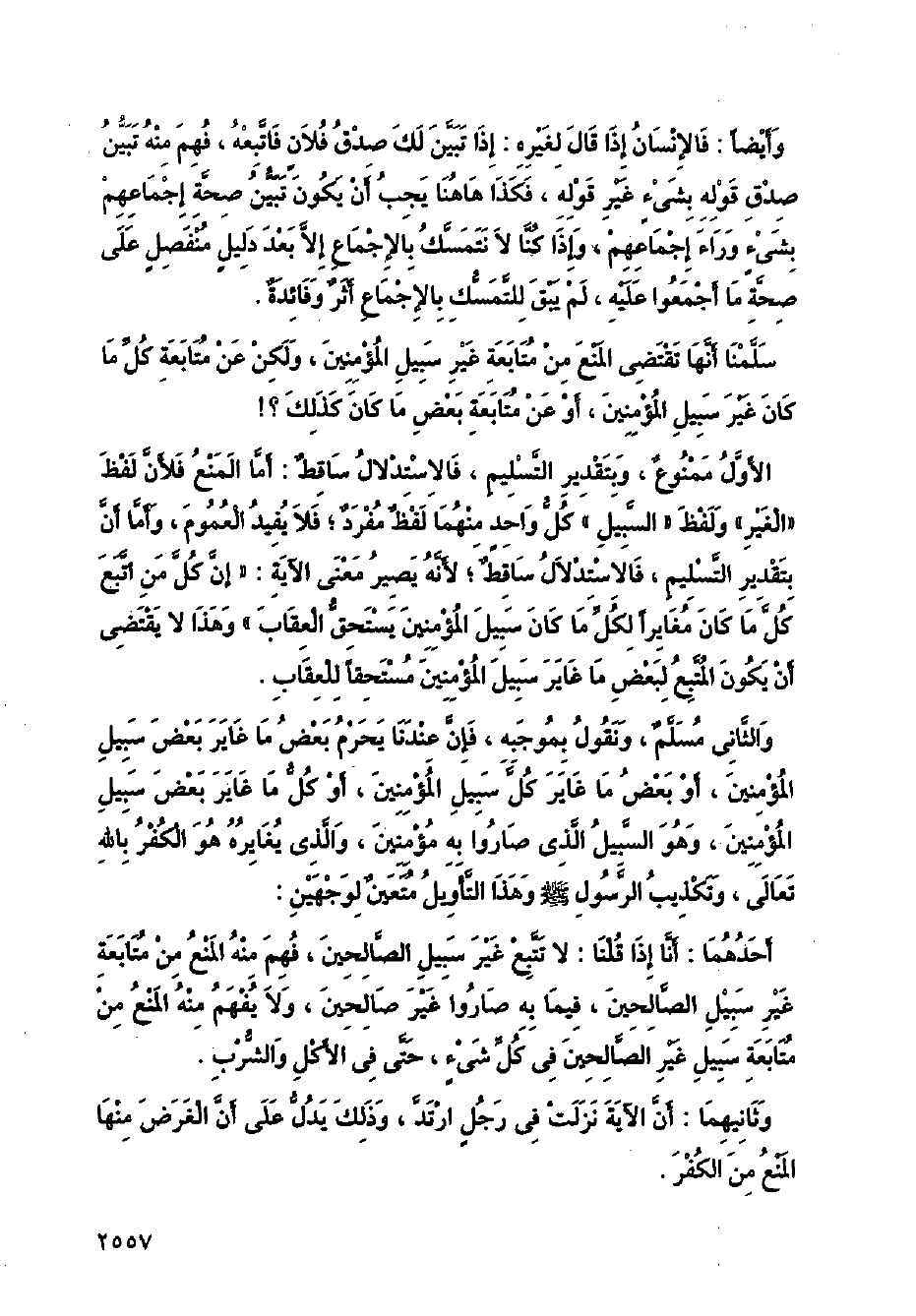 الأول ممنوع، وبتقدير التسليم، فالاستدلال ساقط: أما المنع فلأن لفظ (الغير) ولفظ (السبيل) كل واحد منهما لفظ مفرد؛ يفيد العموم، وأما أن بتقدير التسليم، فالاستدلال ساقط؛ لأنه يصير معنى الآية: (إن كل من اتبع كل ما كان مغايرًا لكل ما كان سبيل المؤمنين يستحق العقاب) وهذا لا يقتضي أن يكون المتبع لبعض ما غاير سبيل المؤمنين مستحقًا للعقاب.
