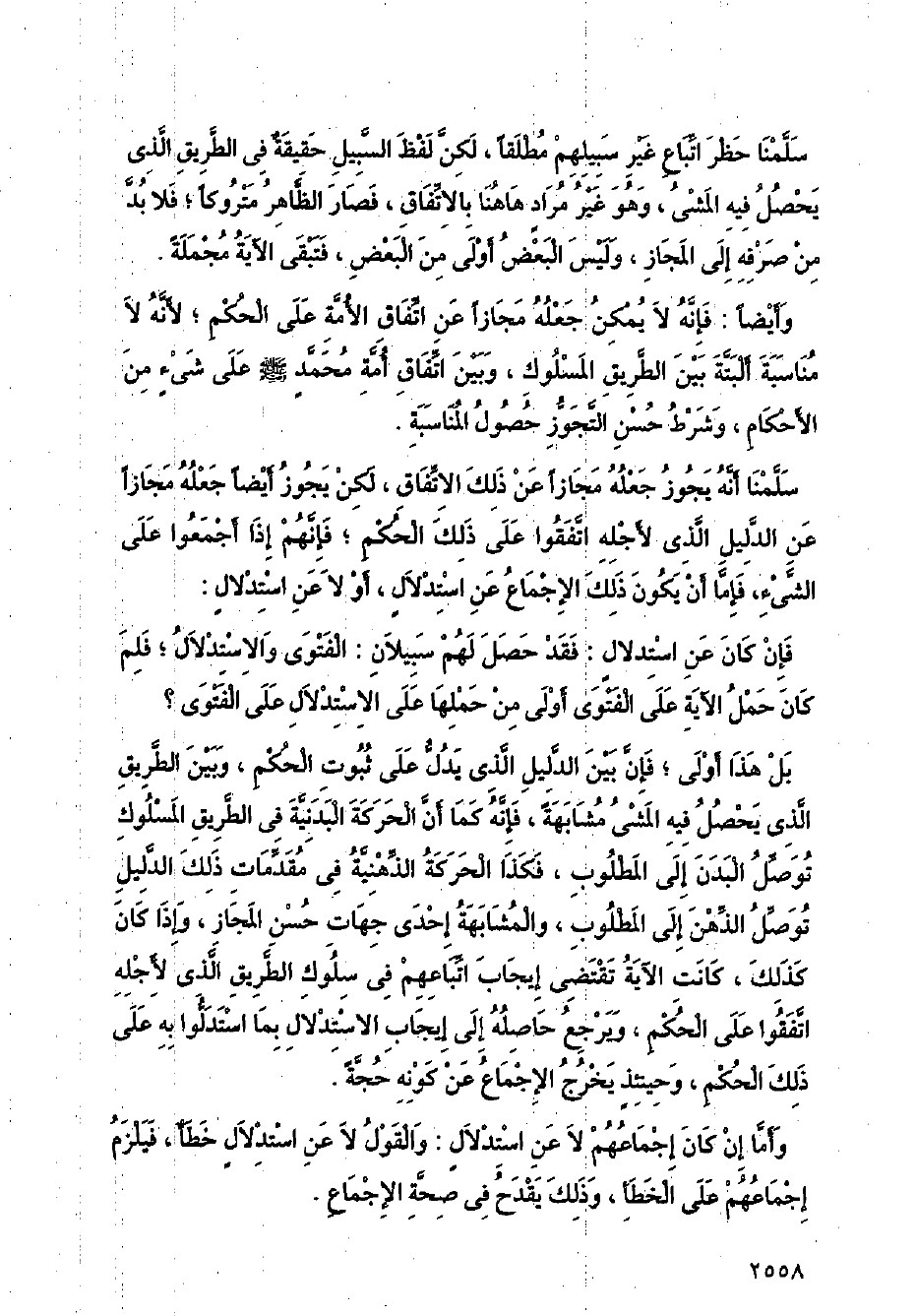 بل هذا أولى؛ فإن بين الدليل الذي يدل على ثبوت الحكم، وبين الطريق الذي يحصل فيه المشي مشابهة، فإنه كما أن الحركة البدنية في الطريق المسلوك توصل البدن إلى المطلوب، فكذا الحركة الذهنية في مقدمات ذلك الدليل توصل الذهن إلى المطلوب، والمشابهة إحدى جهات حسن المجاز، وإذا كان كذلك، كانت الآية تقتضي إيجاب إتباعهم في سلوك الطريق الذي لأجله اتفقوا على الحكم، ويرجع حاصله إلى إيجاب الاستدلال بما استدلوا به على ذلك الحكم، وحينئذ يخرج الإجماع عن كونه حجة.