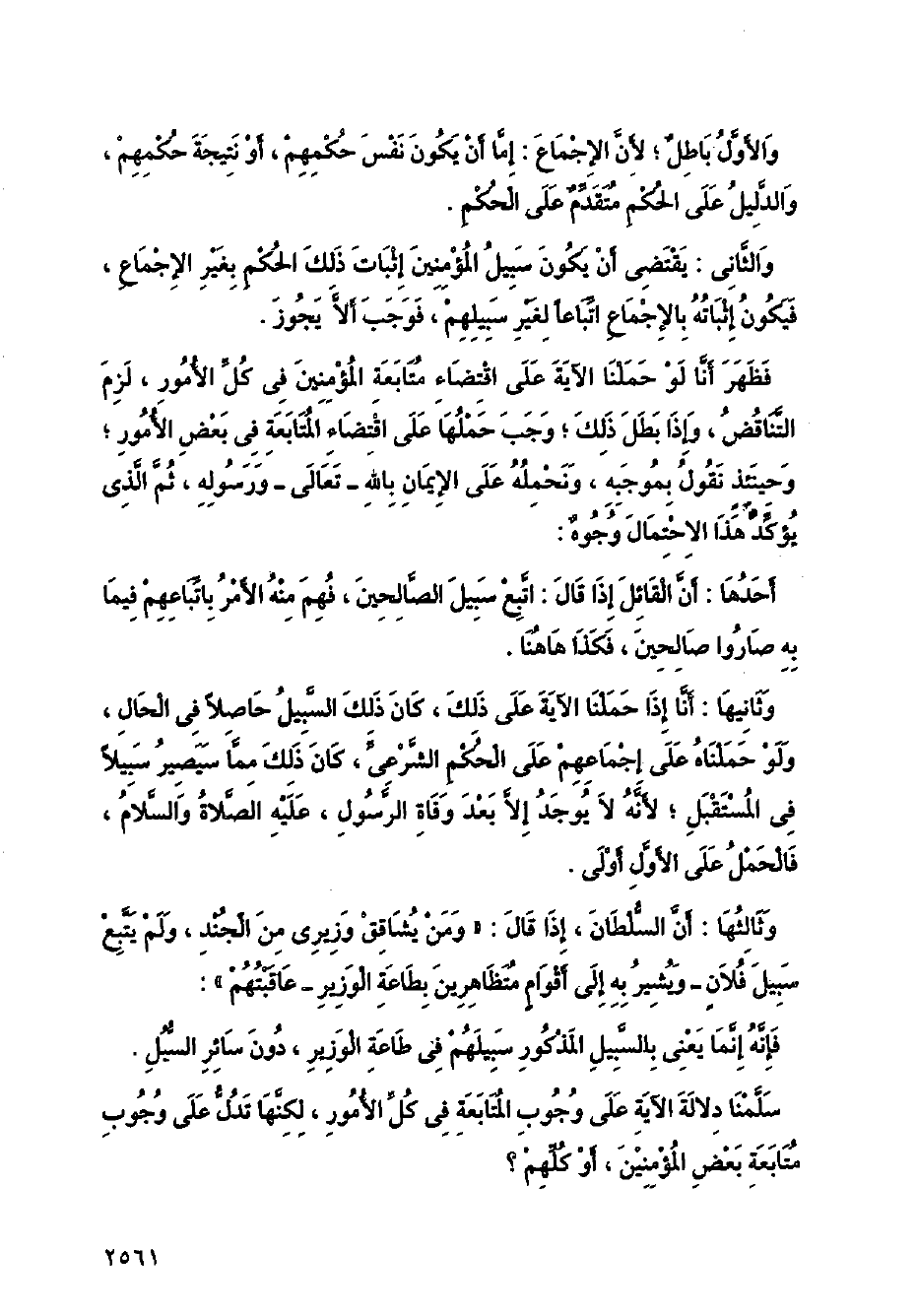 فظهر أنا لو حملنا الآية على اقتضاء متابعة المؤمنين في كل الأمور، لزم التناقض، وإذا بطل ذلك؛ وجب حملها على اقتضاء المتابعة في بعض الأمور؛ وحينئذ نقول بموجبه، ونحمله على الإيمان بالله - تعالى- ورسوله، ثم الذي يؤكد هذا الاحتمال وجوه: