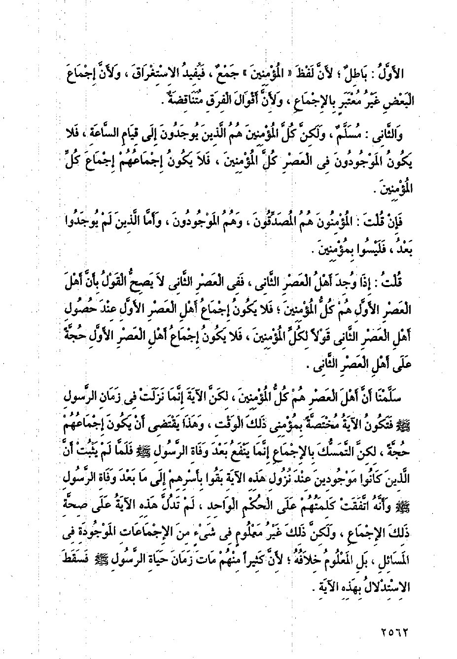 والثاني: مسلم، ولكن كل المؤمنين هم الذين يوجدون إلى قيام الساعة، فلا يكون الموجودون في العصر كل المؤمنين، فلا يكون إجماعهم إجماع كل المؤمنين.