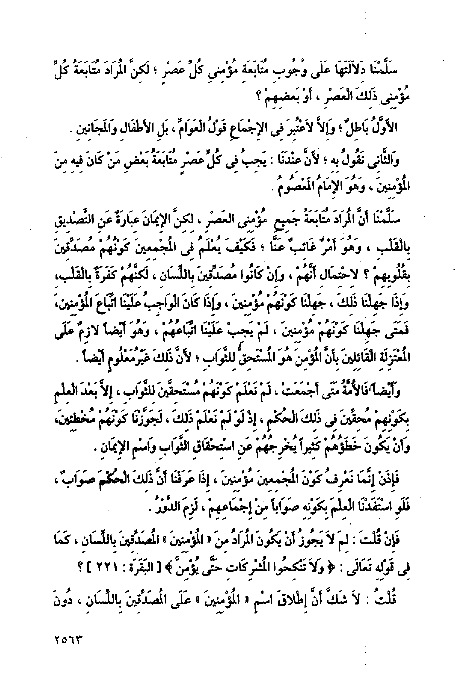 سلمنا أن المراد متابعة جميع مؤمني العصر، لكن الإيمان عبارة عن التصديق بالقلب، وهو أمر غائب عنا؛ فكيف يعلم في المجمعين كونهم مصدقين بقلوبهم؟ لاحتمال أنهم، وإن كانوا مصدقين باللسان، لكنهم كفرة بالقلب، وإذا جهلنا ذلك، جهلنا كونهم مؤمنين، وإذا كان الواجب علينا إتباعهم المؤمنين، فمتى جهلنا كونهم مؤمنين، لم يجب علينا إتباعهم، وهو أيضًا لازم على المعتزلة القائلين بأن المؤمنين هو المستحق للثواب؛ لأن ذلك غير معلومٍ أيضًا.