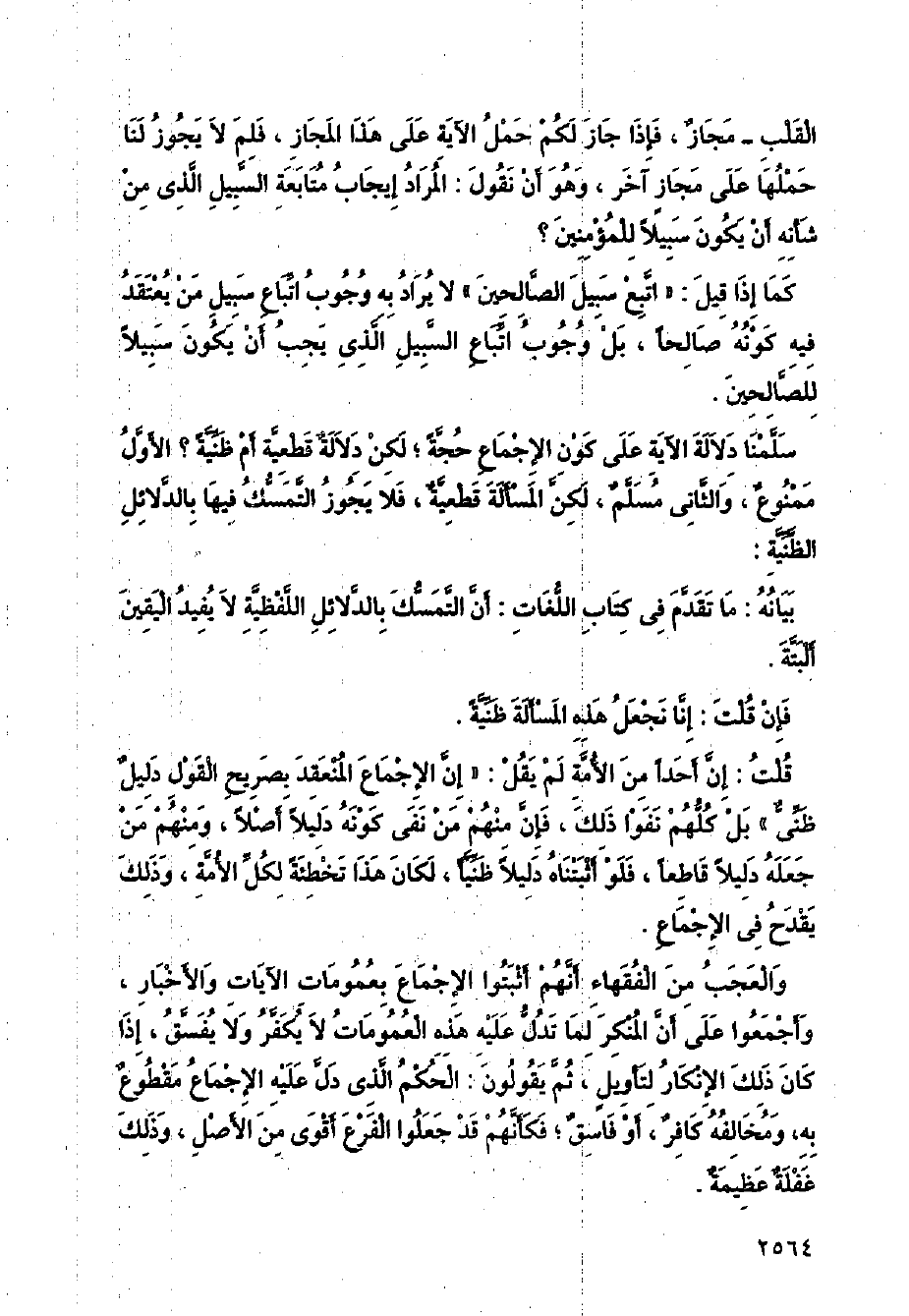 والعجب من الفقهاء أنهم أثبتوا الإجماع بعمومات الآيات والأخبار، وأجمعوا على أن المنكر لما تدل عليه هذه العمومات لا يكفر ولا يفسق، إذا كان ذلك الإنكار لتأويل، ثم يقولون: الحكم الذي دل عليه الإجماع مقطوع به، ومخالفه كافر، أو فاسق؛ فكأنهم قد جعلوا الفرع أقوى من الأصل، وذلك غفلة عظيمة.