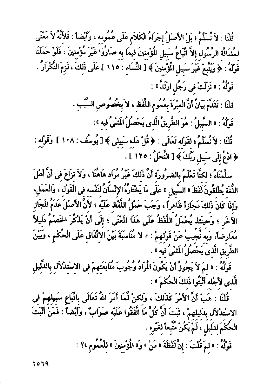 سلمناه؛ لكنا نعلم بالضرورة أن ذلك غير مراد هاهنا، ولا نزاع في أن أهل اللغة يطلقون لفظ (السبيل) على ما يختاره الإنسان لنفسه في القول، والعمل، وإذا كان ذلك مجازًا ظاهرًا، وجب حمل اللفظ عليه؛ لأن الأصل عدم المجاز الآخر؛ وحينئذ يحمل اللفظ على هذا المعنى؛ إلى أن يذكر الخصم دليلا معارضًا، وبه نجيب عن قولهم: (لا مناسبة بين الاتفاق على الحكم، وبين الطريق الذي يحصل المشي فيه).