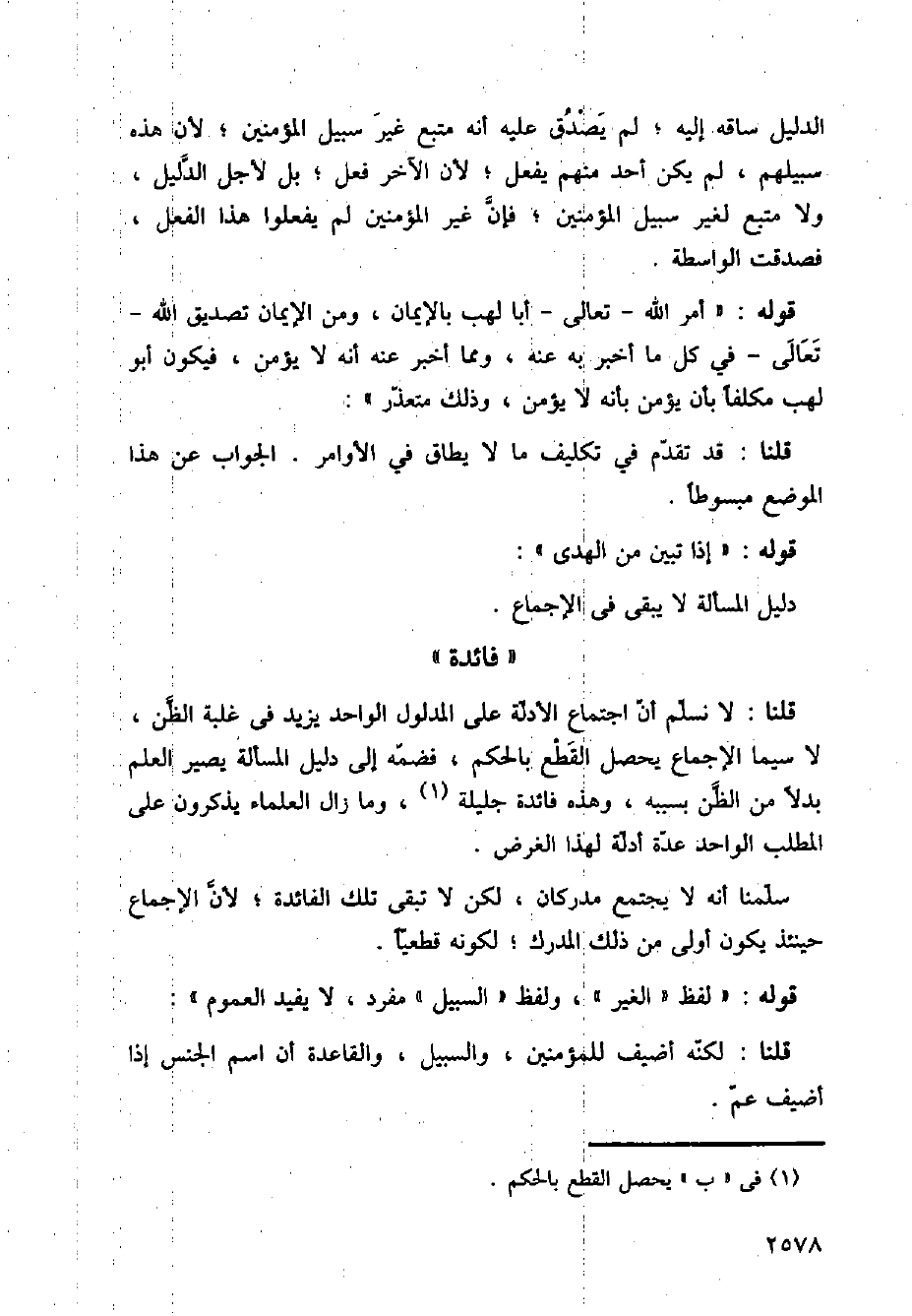 الدليل ساقه إليه، لم يصدق عليه أنه متبع غير سبيل المؤمنين؛ لأن هذه سبيلهم، لم يكن أحد منهم يفعل؛ لأن الآخر فعل؛ بل لأجل الدليل، ولا متبع لغير سبيل المؤمنين؛ فإن غير المؤمنين لم يفعلوا هذا الفعل، فصدقت الواسطة.