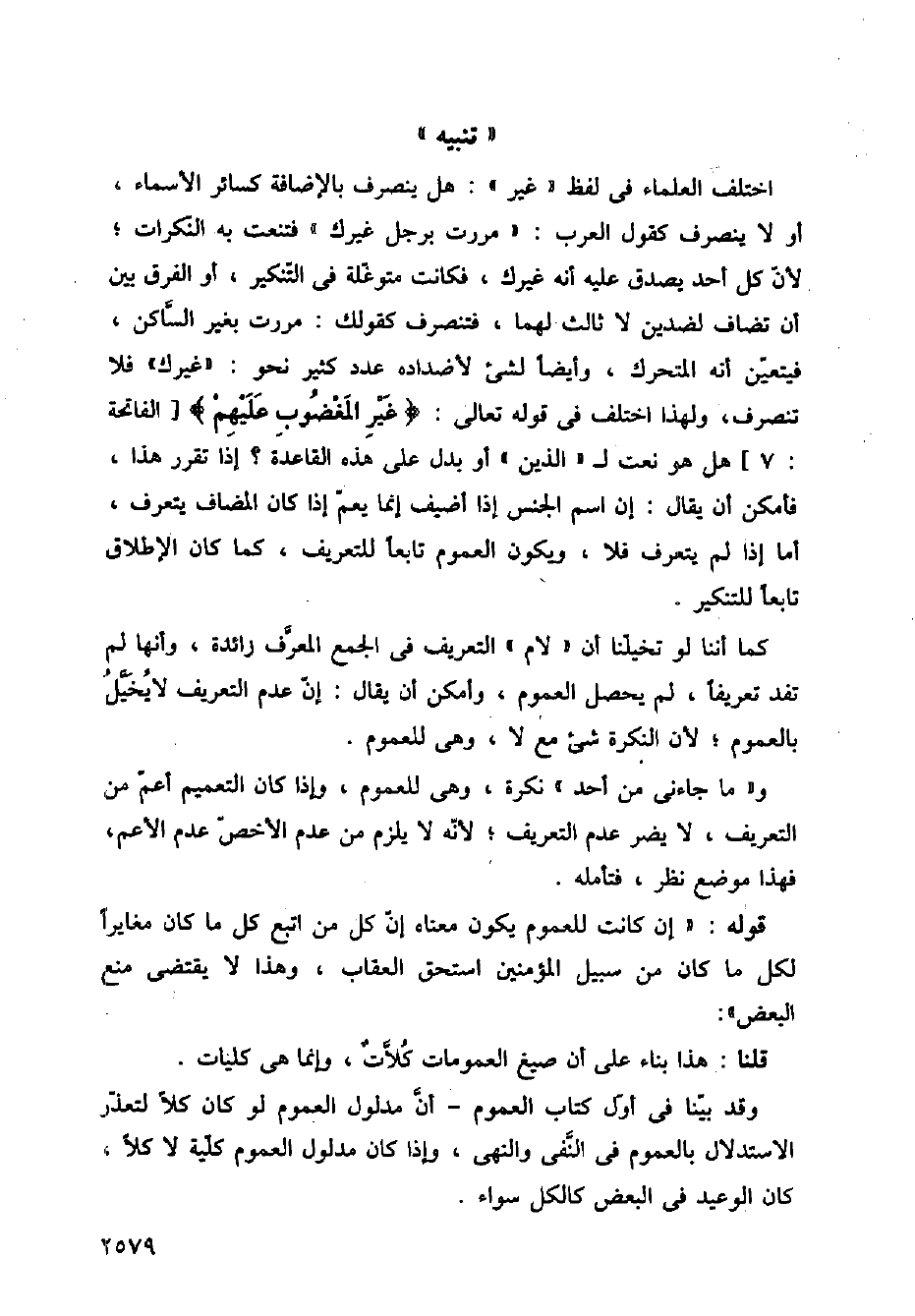 اختلف العلماء في لفظ (غير): هل ينصرف بالإضافة كسائر الأسماء، أو لا ينصرف كقول العرب: (مررت برجل غيرك) فتنعت به النكرات؛ لأن كل أحد يصدق عليه أنه غيرك، فكانت متوغلة في التنكير، أو الفرق بين أن تضاف لضدين لا ثالث لهما، فتنصرف كقولك: مررت بغير الساكن، فيتعين أنه المتحرك، وأيضًا لشيء لأضداده عدد كثير نحو: (غيرك) فلا تنصرف، ولهذا اختلف في قوله تعالى:} غير المغضوب عليهم {[الفاتحة:7] هل هو نعت لـ (الذين) أو بدل على هذه القاعدة؟ إذا تقرر هذا، فأمكن أن يقال: إن اسم الجنس إذا أضيف إنما يعم إذا كان المضاف يتعرف، أما إذا لم يتعرف فلا، ويكون العموم تابعًا للتعريف، كما كان الإطلاق تابعًا للتنكير.