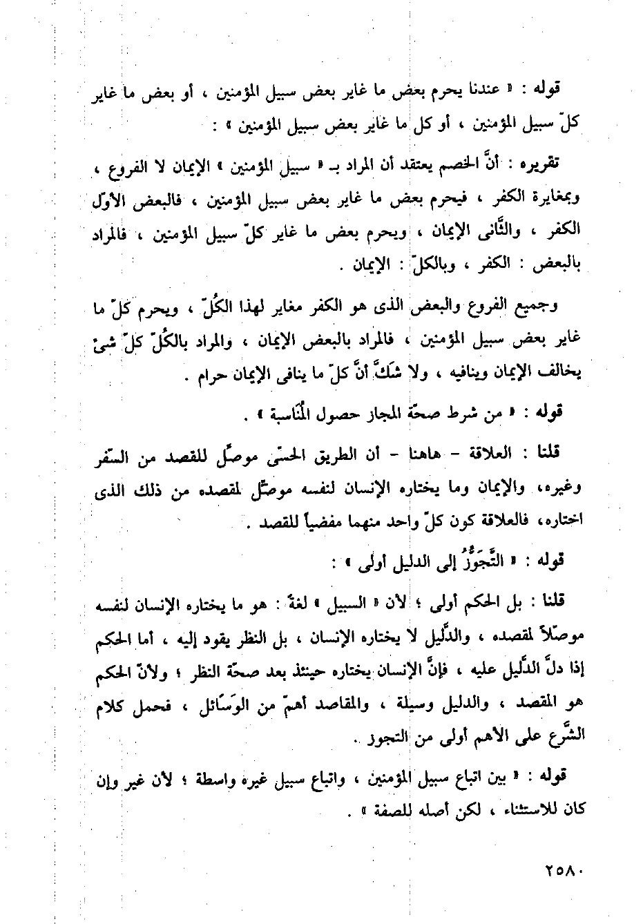 وجميع الفروع والبعض الذي هو الكفر مغاير لهذا الكل، ويحرم كل ما غاير بعض سبيل المؤمنين، فالمراد بالبعض الإيمان، والمراد بالكل كل شيء يخالف الإيمان وينافيه، ولا شك أن كل ما ينافي الإيمان حرام.