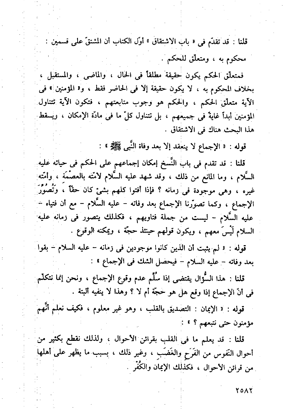 فمتعلق الحكم يكون حقيقة مطلقًا في الحال، والماضي، والمستقبل، بخلاف المحكوم به، لا يكون حقيقة إلا في الحاضر فقط، و (المؤمنين) في الآية متعلق الحكم، والحكم هو وجوب متابعتهم، فتكون الآية تتناول المؤمنين أبدًا غاية في جميعهم، بل تتناول كل ما في مادة الإمكان، ويسقط هذا البحث هناك في الاشتقاق.