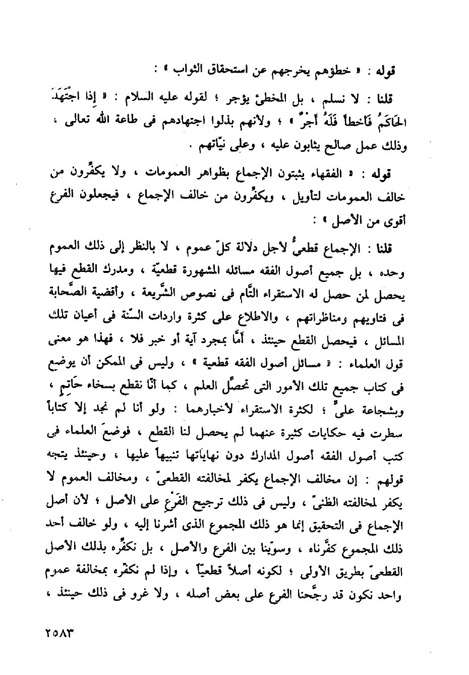 قوله: (الفقهاء يثبتون الإجماع بظواهر العمومات، ولا يكفرون من خالف العمومات لتأويل، ويكفرون من خالف الإجماع، فيجعلون الفرع أقوى من الأصل):