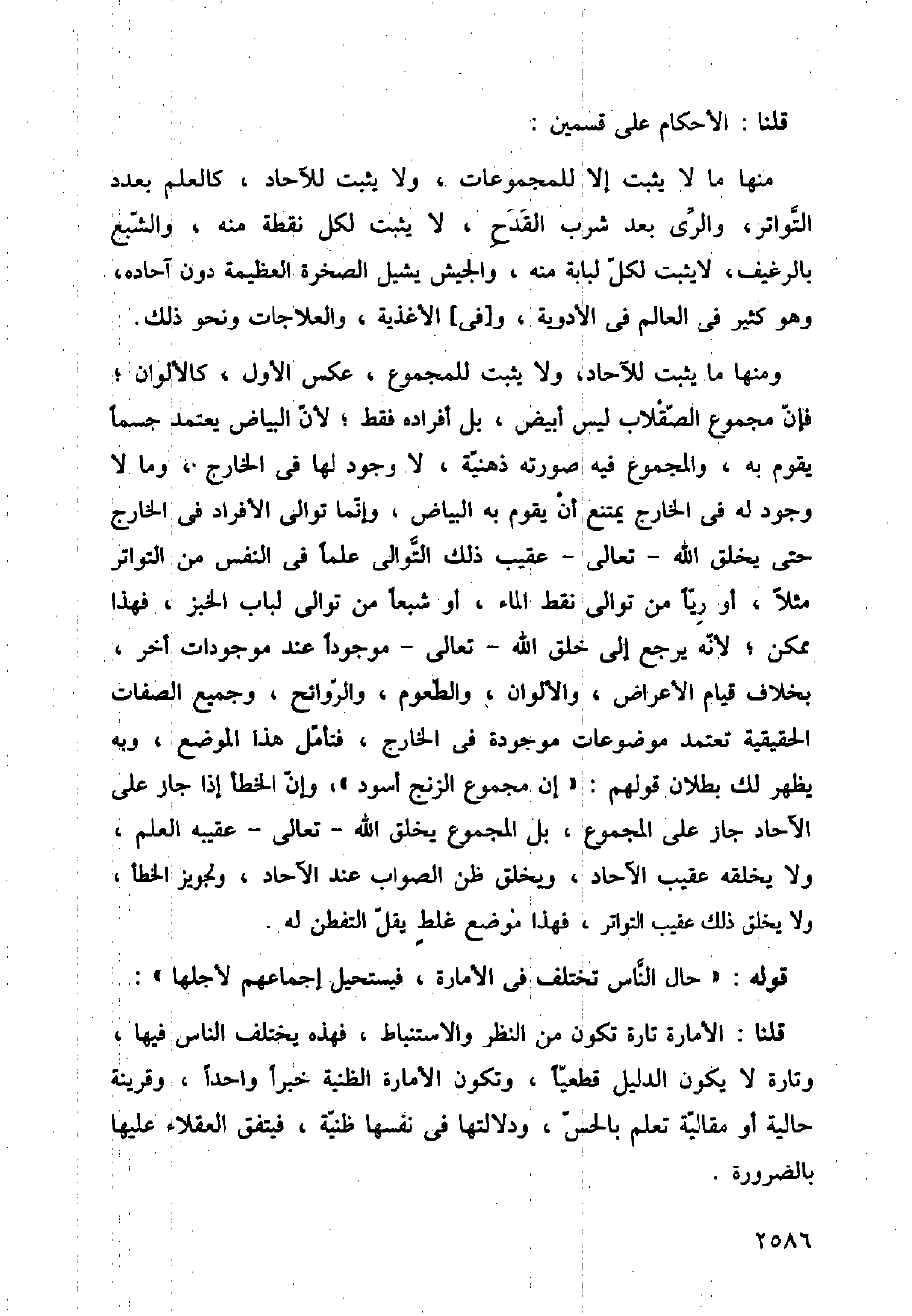 ومنها ما يثبت للآحاد، ولا يثبت للمجموع، عكس الأول، كالألوان؛ فإن مجموع الصقلاب ليس أبيض، بل أفراده فقط؛ لأن البياض يعتمد جسمًا يقوم به، والمجموع فيه صورته ذهنية، لا وجود لها في الخارج، وما لا وجود له في الخارج يمتنع أن يقوم به البياض، وإنما توالي الأفراد في الخارج حتى يخلق الله - تعالى - عقيب ذلك التوالي علمًا في النفس من التواتر مثلا، أو ريا من توالي نقط الماء، أو شبعًا من توالي لباب الخبز، فهذا ممكن؛ لأنه يرجع إلى خلق الله - تعالى - موجودًا عند موجودات أخر، بخلاف قيام الأعراض، والألوان، والطعوم، والروائح، وجميع الصفات الحقيقية تعتمد موضوعات موجودة في الخارج، فتأمل هذا الموضع، وبه يظهر لك بطلان قولهم: (إن مجموع الزنج أسود)، وإن الخطأ إذا جاز على الآحاد جاز على المجموع، بل المجموع يخلق الله - تعالى - عقيبه العلم، ولا يخلقه عقيب الآحاد، ويخلق ظن الصواب عند الآحاد، وتجويز الخطأ، ولا يخلق ذلك عقيب التواتر، فهذا موضع غلط يقل التفطن له.