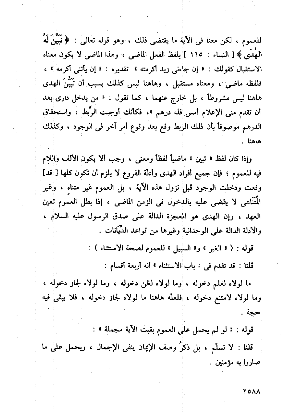 وإذا كان لفظ (تبين) ماضيًا لفظًا ومعنى، وجب ألا يكون الألف واللام فيه للعموم؛ فإن جميع أفراد الهدى وأدلة الفروع لا يلزم أن تكون كلها [قد] وقعت ودخلت الوجود قبل نزول هذه الآية، بل العموم غير متناهٍ، وغير المتناهي لا يقضي عليه بالدخول في الزمن الماضي، إذا بطل العموم تعين العهد، وإن الهدى هو المعجزة الدالة على صدق الرسول عليه السلام، والأدلة الدالة على الوحدانية وغيرها من قواعد الديانات.