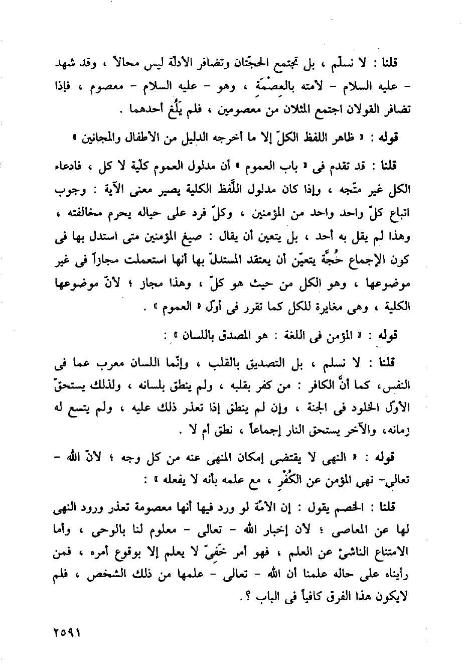قلنا: قد تقدم في (باب العموم) أن مدلول العموم كلية لا كل، فادعاء الكل غير متجه، وإذا كان مدلول اللفظ الكلية يصير معنى الآية: وجوب إتباع كل واحد واحد من المؤمنين، وكل فرد على حياله يحرم مخالفته، وهذا لم يقل به أحد، بل يتعين أن يقال: صيغ المؤمنين متى استدل بها في كون الإجماع حجة يتعين أن يعتقد المستدل بها أنها استعملت مجازًا في غير موضوعها، وهو الكل من حيث هو كل، وهذا مجاز؛ لأن موضوعها الكلية، وهي مغايرة للكل كما تقرر في أول (العموم).