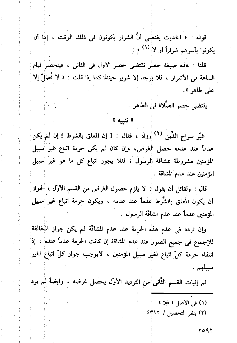 غير سراج الدين وزاد، فقال: [إن المعلق بالشرط] إن لم يكن عدمًا عند عدمه حصل الغرض، وإن كان لم يكن حرمة إتباع غير سبيل المؤمنين مشروطة بمشاقة الرسول؛ لئلا يجوز إتباع كل ما هو غير سبيل المؤمنين عند عدم المشاقة.