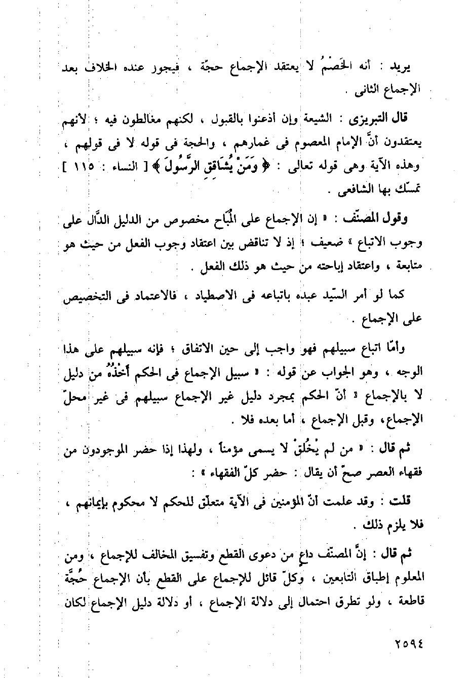 قال التبريزي: الشيعة وإن أذعنوا بالقبول، لكنهم مغالطون فيه؛ لأنهم يعتقدون أن الإمام المعصوم في غمارهم، والحجة في قوله لا في قولهم، وهذه الآية وهي قوله تعالى:} ومن يشاقق الرسول {[النساء:115] تمسك بها الشافعي.