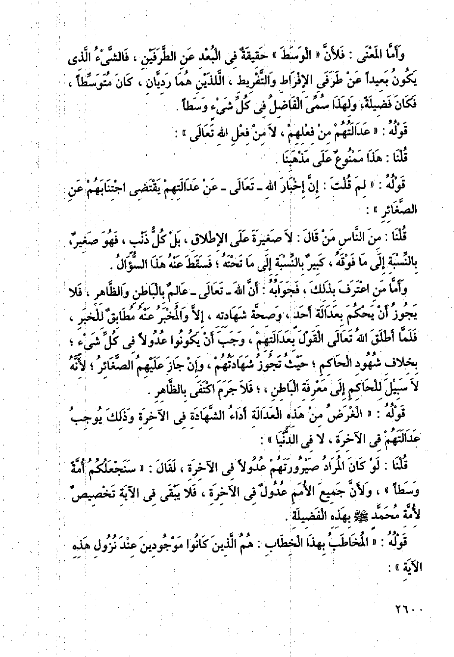 قلنا: لو كان المراد صيرورتهم عدولا في الآخرة، لقال: (سنجعلكم أمة وسطًا)، ولأن جميع الأمم عدول في الآخرة، فلا يبقي في الآية تخصيص لأمة محمد - صلى الله عليه وسلم - بهذه الفضيلة.