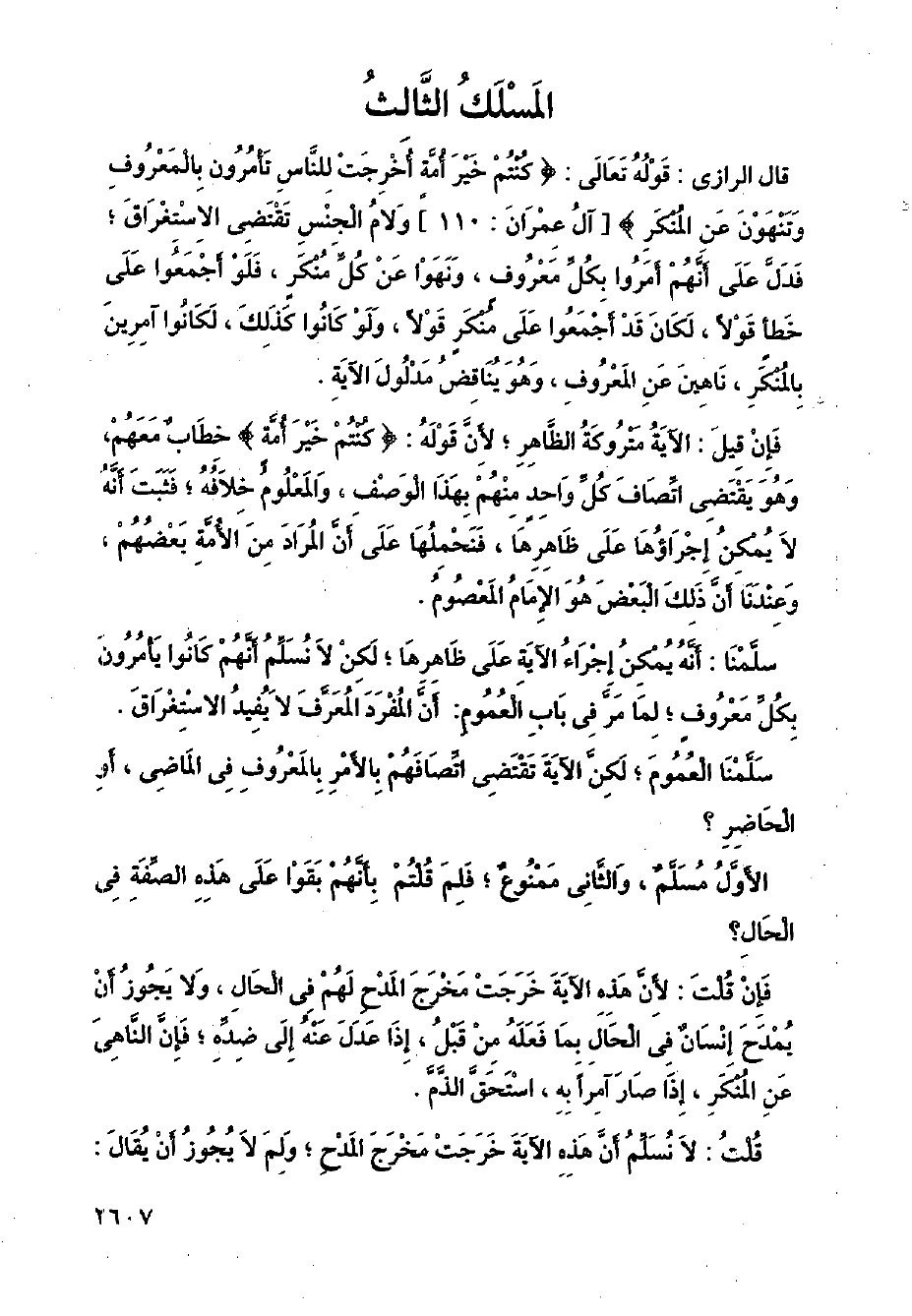 قال الرازي: قوله تعالى:} كنتم خير أمة أخرجت للناس تأمرون بالمعروف وتنهون عن المنكر {[آل عمران: 110] ولام الجنس تقتضي الاستغراق؛ فدل على أنهم أمروا بكل معروف، ونهوا عن كل منكرٍ، فلو أجمعوا على خطأ قولا، لكان قد أجمعوا على منكر قولا، ولو كانوا كذلك، لكانوا آمرين بالمنكر، ناهين عن المعروف، وهو يناقض مدلول الآية.