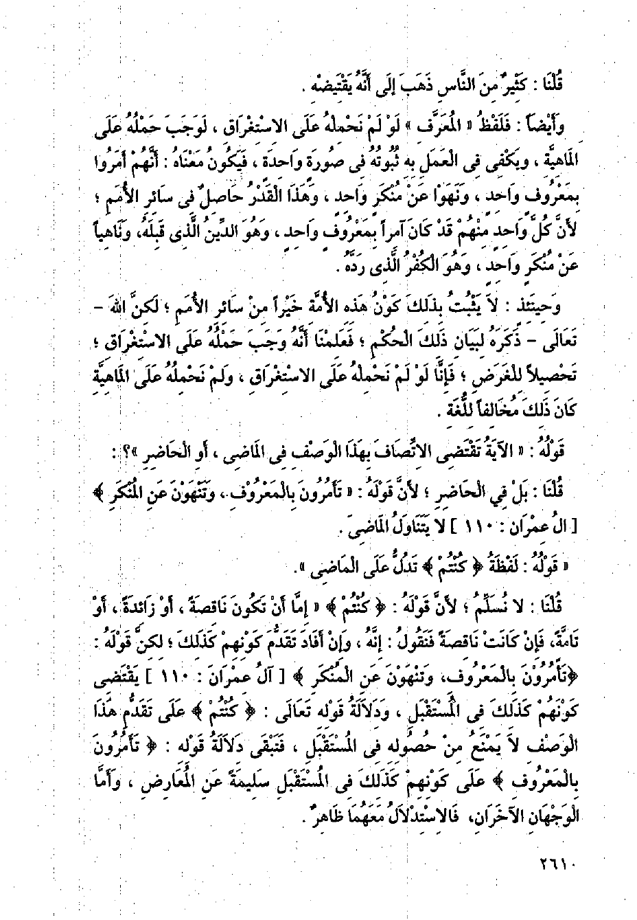 وأيضًا: فلفظ (المعرف) لو لم نحمله على الاستغراق، لوجب حمله على الماهية، ويكفي في العمل به ثبوته في صورةٍ واحدة، فيكون معناه: أنهم أمروا بمعروف واحد، ونهوا عن منكر واحد، وهذا القدر حاصل في سائر الأمم؛ لأن كل واحدٍ منهم قد كان آمرًا بمعروفٍ واحدٍ، وهو الدين الذي قبله، وناهيًا عن منكرٍ واحدٍ، وهو الكفر الذي رده.
