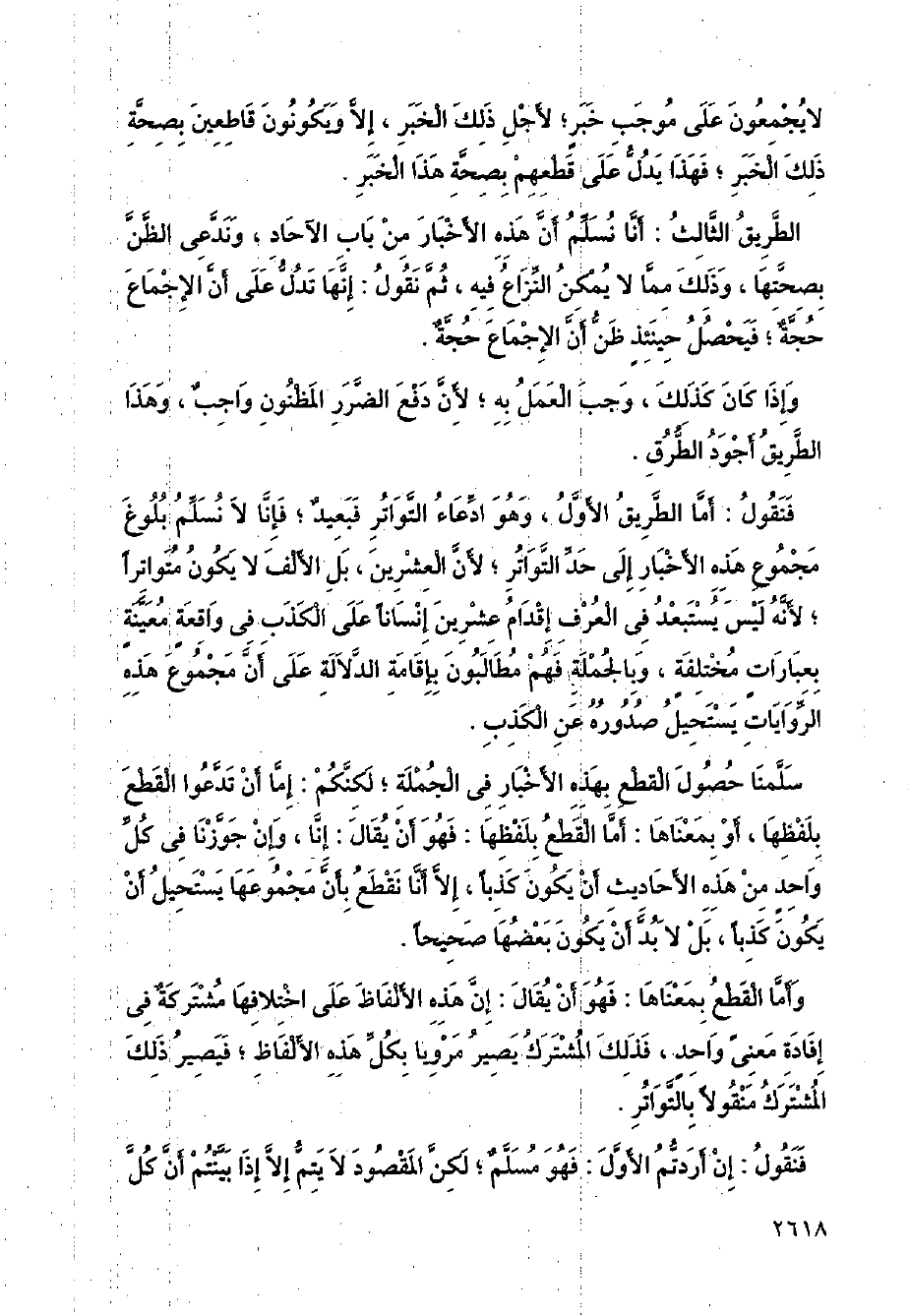 فنقول: أما الطريق الأول، وهو ادعاء التواتر فبعيد؛ فإنا لا نسلم بلوغ مجموع هذه الأخبار إلى حد التواتر؛ لأن العشرين، بل الألف لا يكون متواترًا؛ لأنه ليس يستبعد في العرف إقدام عشرين إنسانًا على الكذب في واقعةٍ معينة بعباراتٍ مختلفةٍ، وبالجملة فهم مطالبون بإقامة الدلالة على أن مجموع هذه الروايات يستحيل صدوره عن الكذب.