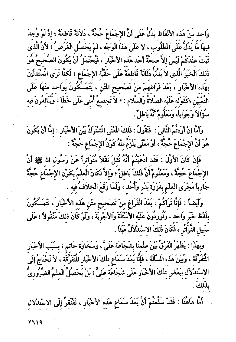 واحد من هذه الألفاظ يدل على أن الإجماع حجة، دلالة قاطعةً؛ إذ لو وجد فيها ما يدل على المطلوب، لا على هذا الوجه، لم يحصل الغرض؛ لأن الذي ثبت عندكم ليس إلا صحة أحد هذه الأخبار، فيحتمل أن يكون الصحيح هو ذلك الخبر الذي لا يدل دلالةً قاطعةً على حقية الإجماع؛ لكنا نرى المستدلين بهذه الأخبار، بعد فراغهم من تصحيح المتن، يتمسكون بواحد منها على التعيين؛ كقوله عليه الصلاة والسلام: (لا تجتمع أمتي على خطأ) ويبالغون فيه سؤالا وجوابًا، ومعلوم أنه باطل.