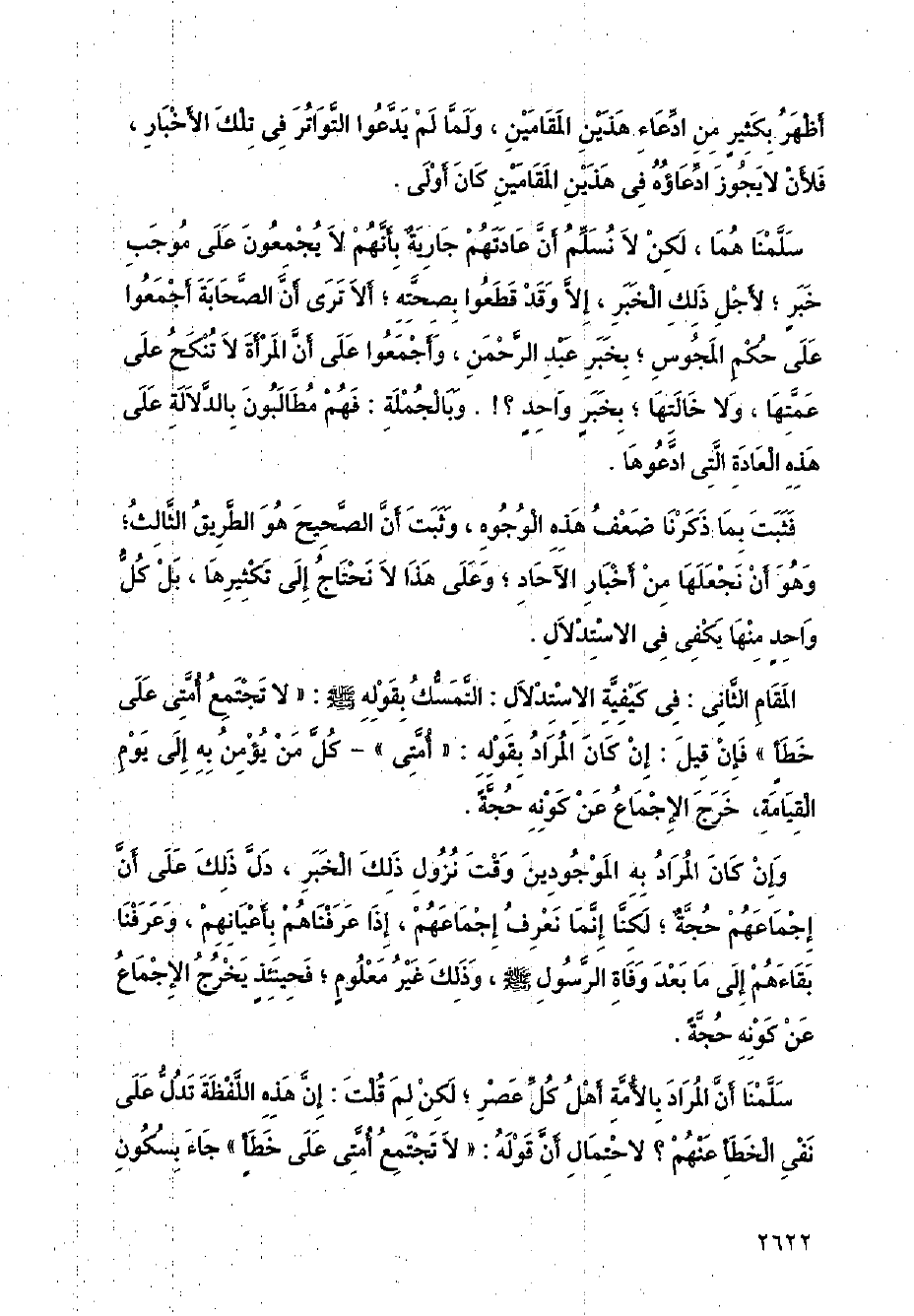 سلمنا أن المراد بالأمة أهل كل عصر؛ لكن لم قلت: إن هذه اللفظة تدل على نفي الخطأ عنهم؟ لاحتمال أن قوله: (لا تجتمع أمتي على خطأٍ) جاء بسكون