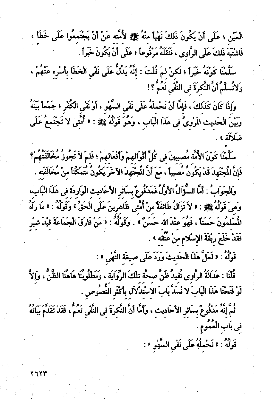 وإذا كان كذلك، فإما أن نحمله على نفي السهو، أو نفي الكفر؛ جمعًا بينه وبين الحديث المروى في هذا الباب، وهو قوله - صلى الله عليه وسلم -: (أمتي لا تجتمع على ضلالة).