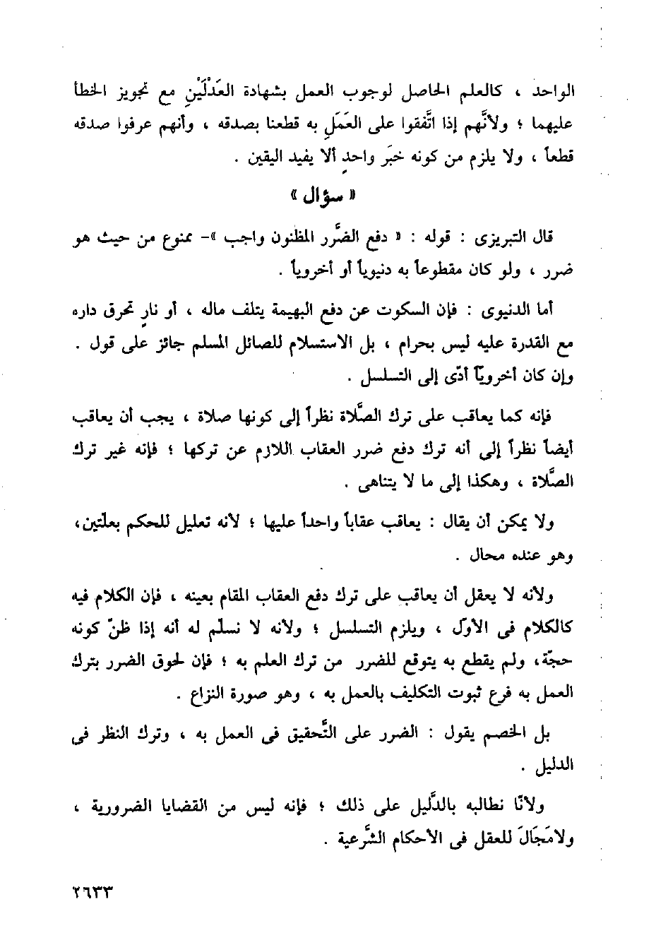 قال التبريزي: قوله: (دفع الضرر المظنون واجب) - ممنوع من حيث هو ضرر، ولو كان مقطوعًا به دنيويًا أو أخرويًا.