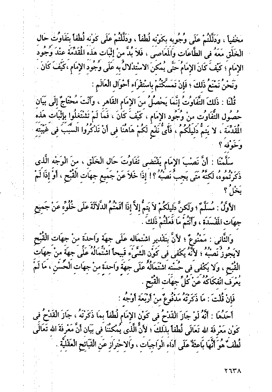 سلمنا: أن نصب الإمام يقتضي تفاوت حال الخلق، من الوجه الذي ذكرتموه، لكنه متى يجب نصبه؟! إذا خلال عن جميع جهات القبح، أو إذا لم يخل؟