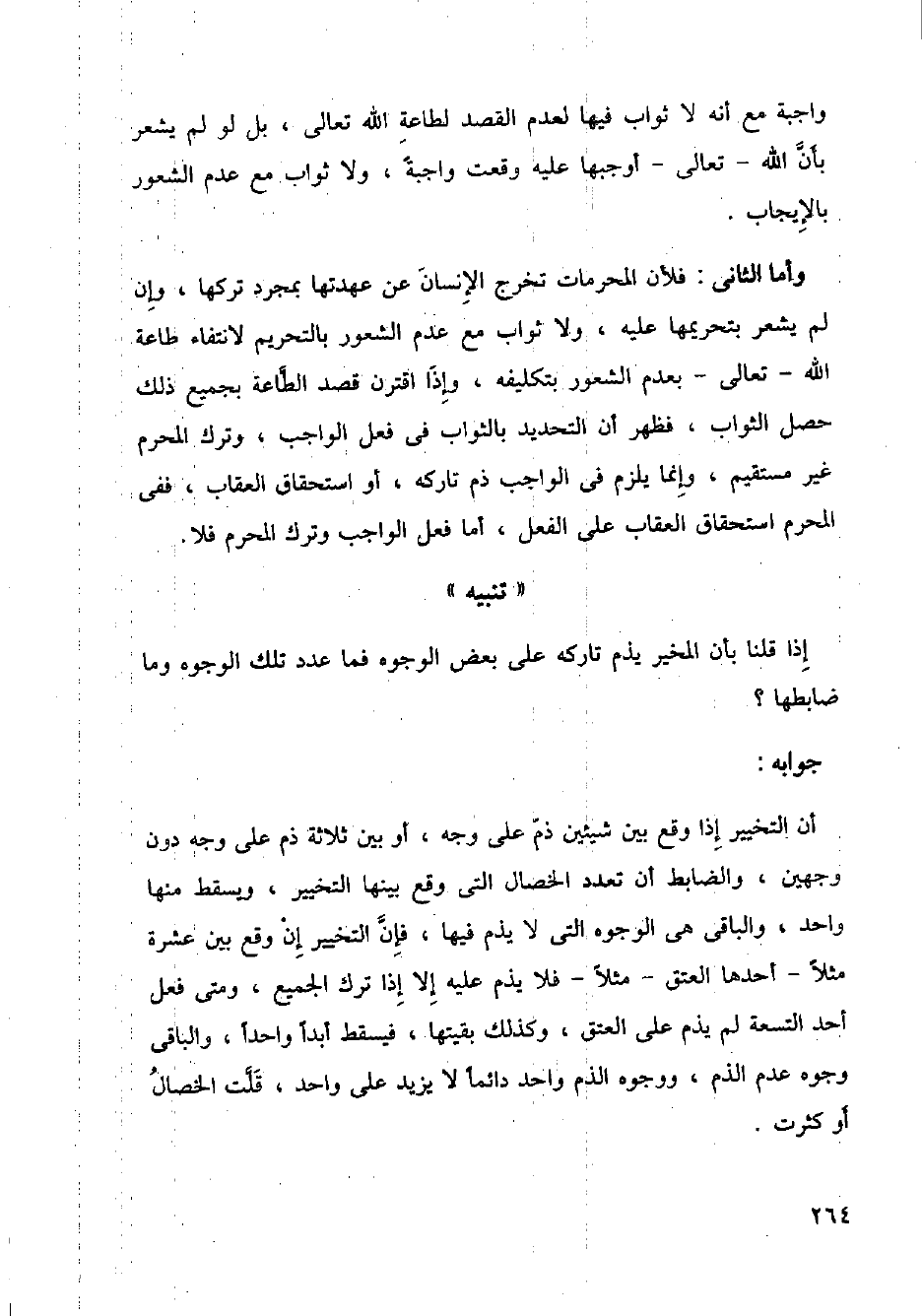 وأما الثاني: فلأن المحرمات تخرج الإنسان عن عهدتها بمجرد تركها، وإن لم يشعر بتحريمها عليه، ولا ثواب مع عدم الشعور بالتحريم لانتفاء طاعة الله - تعالى - بعدم الشعور بتكليفه، وإذا اقترن قصد الطاعة بجميع ذلك حصل الثواب، فظهر أن التحديد بالثواب في فعل الواجب، وترك المحرم غير مستقيم، وإنما يلزم في الواجب ذم تاركه، أو استحقاق العقاب، ففي المحرم استحقاق العقاب على الفعل، أما فعل الواجب وترك المحرم فلا.