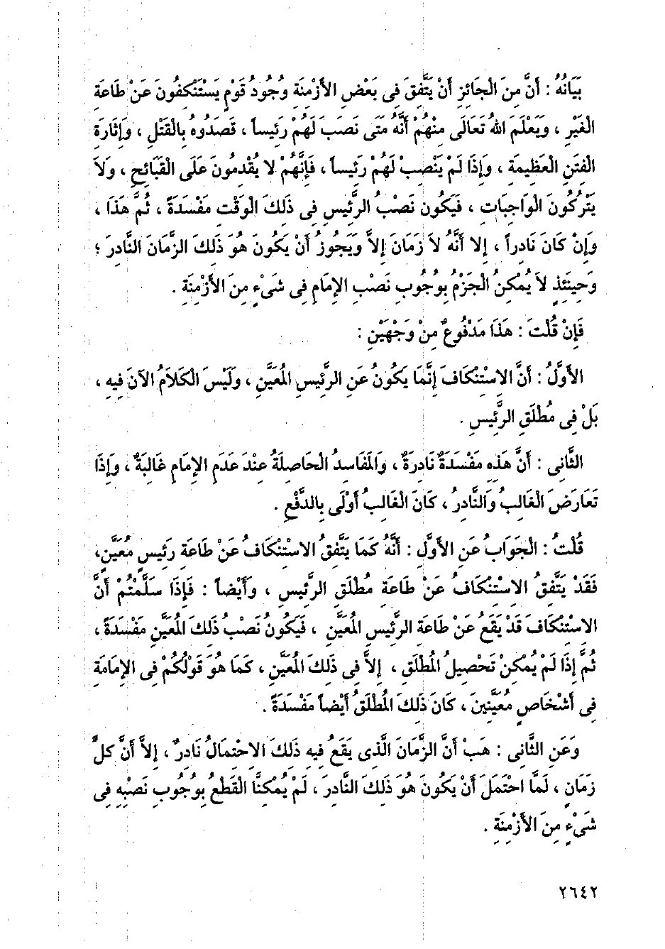 بيانه: أن من الجائز أن يتفق في بعض الأزمنة وجود قوم يستنكفون عن طاعة الغير، ويعلم الله تعالى منهم أنه متى نصب لهم رئيسًا، قصدوه بالقتل، وإثارة الفتن العظيمة، وإذا لم ينصب لهم رئيسًا، فإنهم لا يقدمون على القبائح، ولا يتركون الواجبات، فيكون نصب الرئيس في ذلك الوقت مفسدةً، ثم هذا، وإن كان نادرًا، إلا أنه لا زمان إلا ويجوز أن يكون هو ذلك الزمان النادر؛ وحينئذٍ لا يمكن الجزم بوجوب نصب الإمام في شيءٍ من الأزمنة.