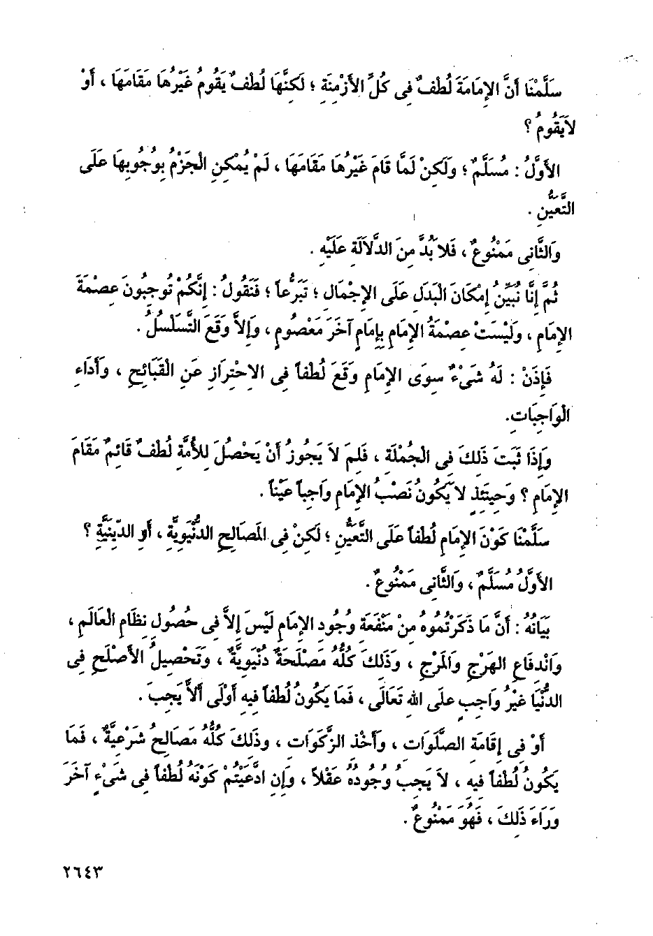 أو في إقامة الصلوات، وأخذ الزكوات، وذلك كله مصالح شرعية، فما يكون لطفًا فيه، لا يجب وجوده عقلا، وإن ادعيتم كونه لطفًا في شيءٍ آخر وراء ذلك، فهو ممنوع.