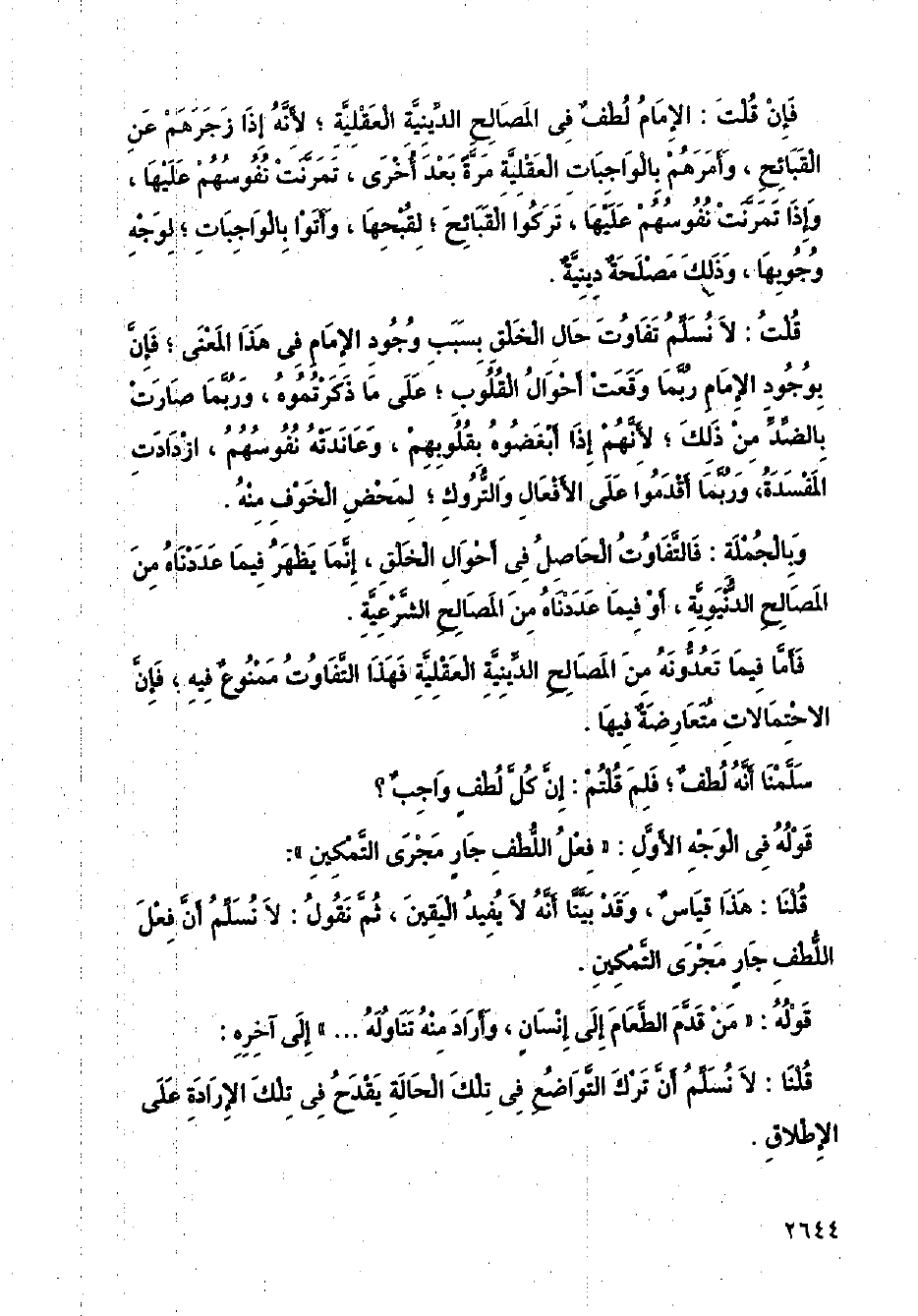 فإن قلت: الإمام لطف في المصالح الدينية العقلية؛ لأنه إذا زجرهم عن القبائح، وأمرهم بالواجبات العقلية مرةً بعد أخرى، تمرنت نفوسهم عليها، وإذا تمرنت نفوسهم عليها، تركوا القبائح؛ لقبحها، وأتوا بالواجبات؛ لوجه وجوبها، وذلك مصلحة دينية.