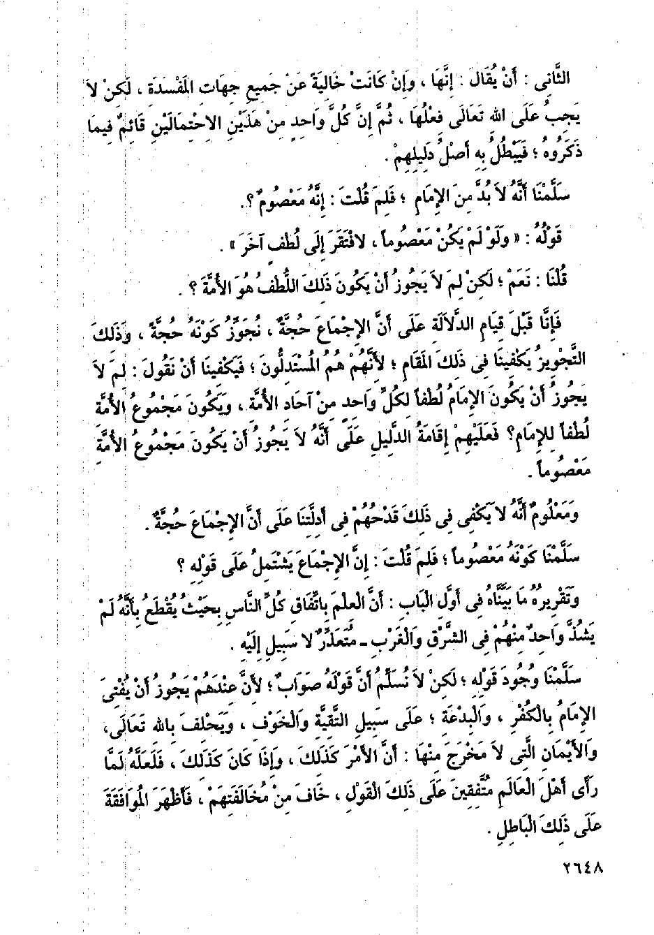 فإنا قبل قيام الدلالة على أن الإجماع حجةٌ، نجوز كونه حجةً، وذلك التجويز يكفينا في ذلك المقام؛ لأنهم هم المستدلون؛ فيكفينا أن نقول: لم لا يجوز أن يكون الإمام لطفًا لكل واحدٍ من آحاد الأمة، ويكون مجموع الأمة لطفًا للإمام؟ فعليهم إقامة الدليل على أنه لا يجوز أن يكون مجموع الأمة معصومًا.